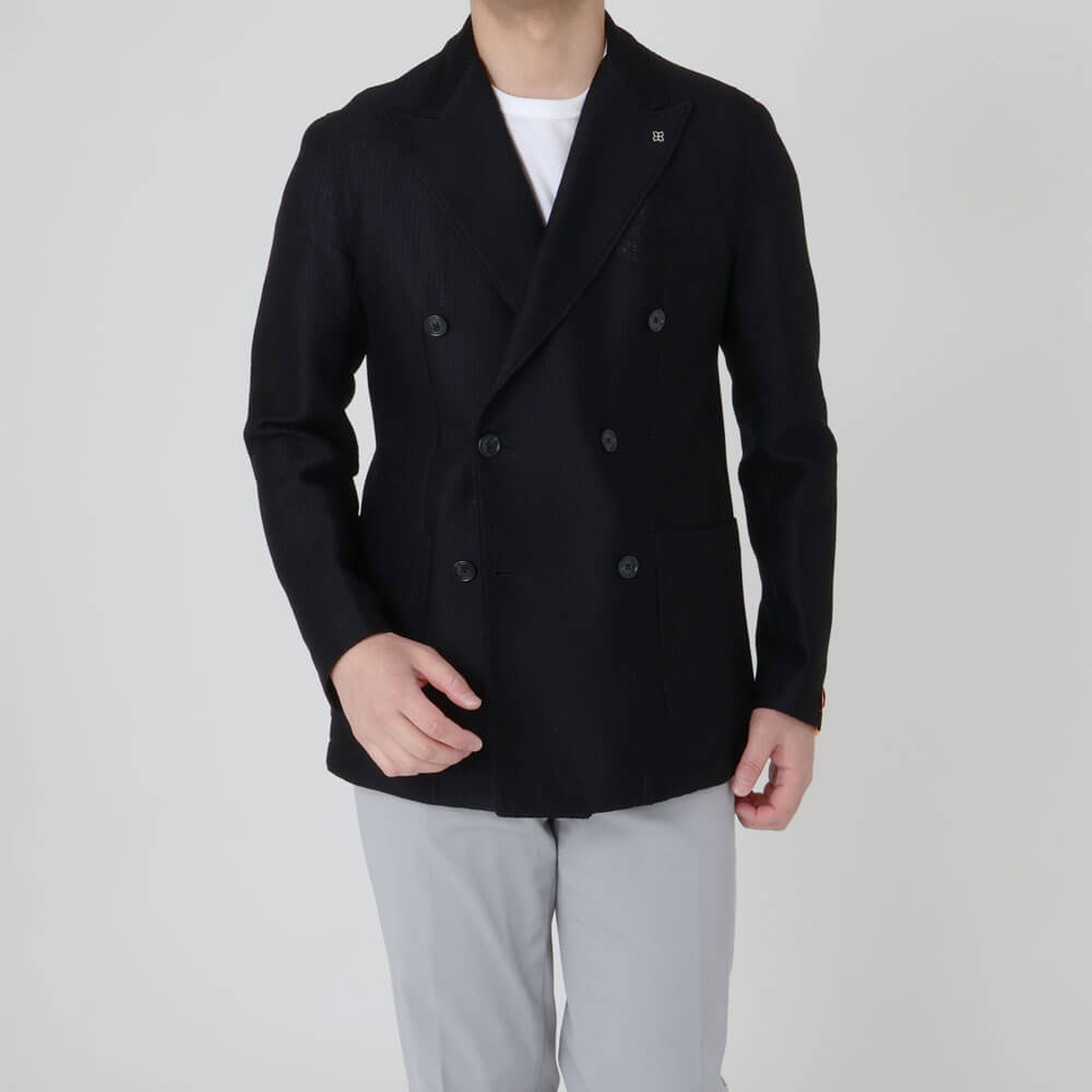 ・こちらは6つボタンダブルでありながら、前合わせが深くないため、前開きで着用してもサマになる一着。