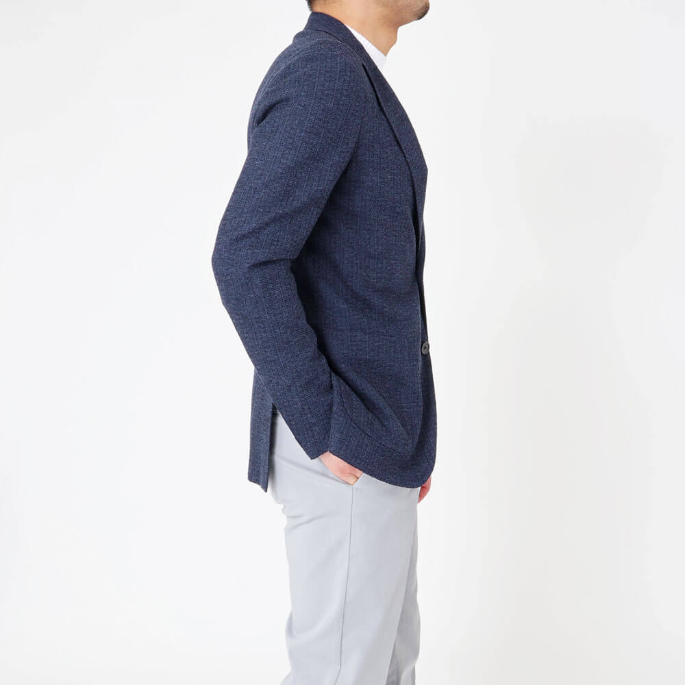・ニットの裏面に伸縮性を備えたメンブレン(薄い膜状の層)を貼ることで、柔らかなニットでもテーラードジャケットと同じような見え方に仕上がるのです。
