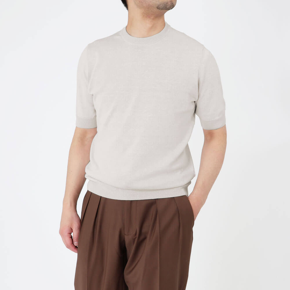 ・表はリネンの清涼感が際立つメランジ調、裏は肌当たりが良いように滑らかに編み立てられており、ハイゲージながら薄過ぎない編み地です。