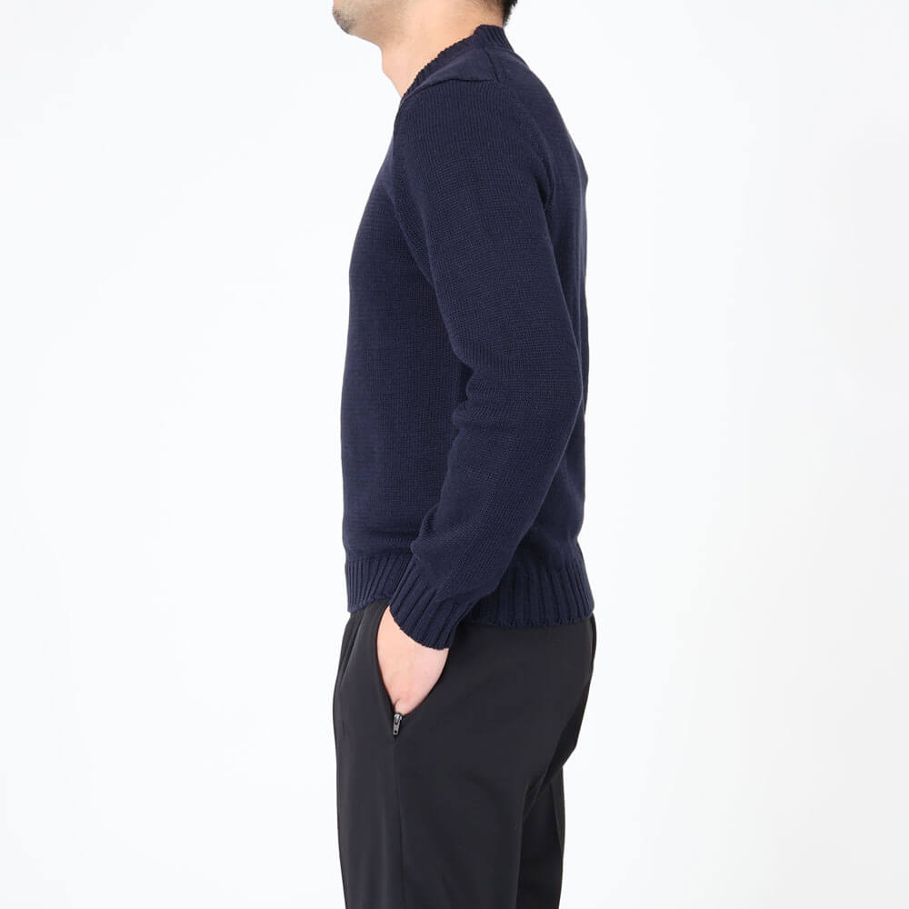 ・素材はリネン&コットンで5本の糸を撚り合わせ編まれたミドルゲージ。リネン特有のザラっと感が少ない柔らかみあるタッチゆえ、素肌に着られるほど快適な着心地です。
