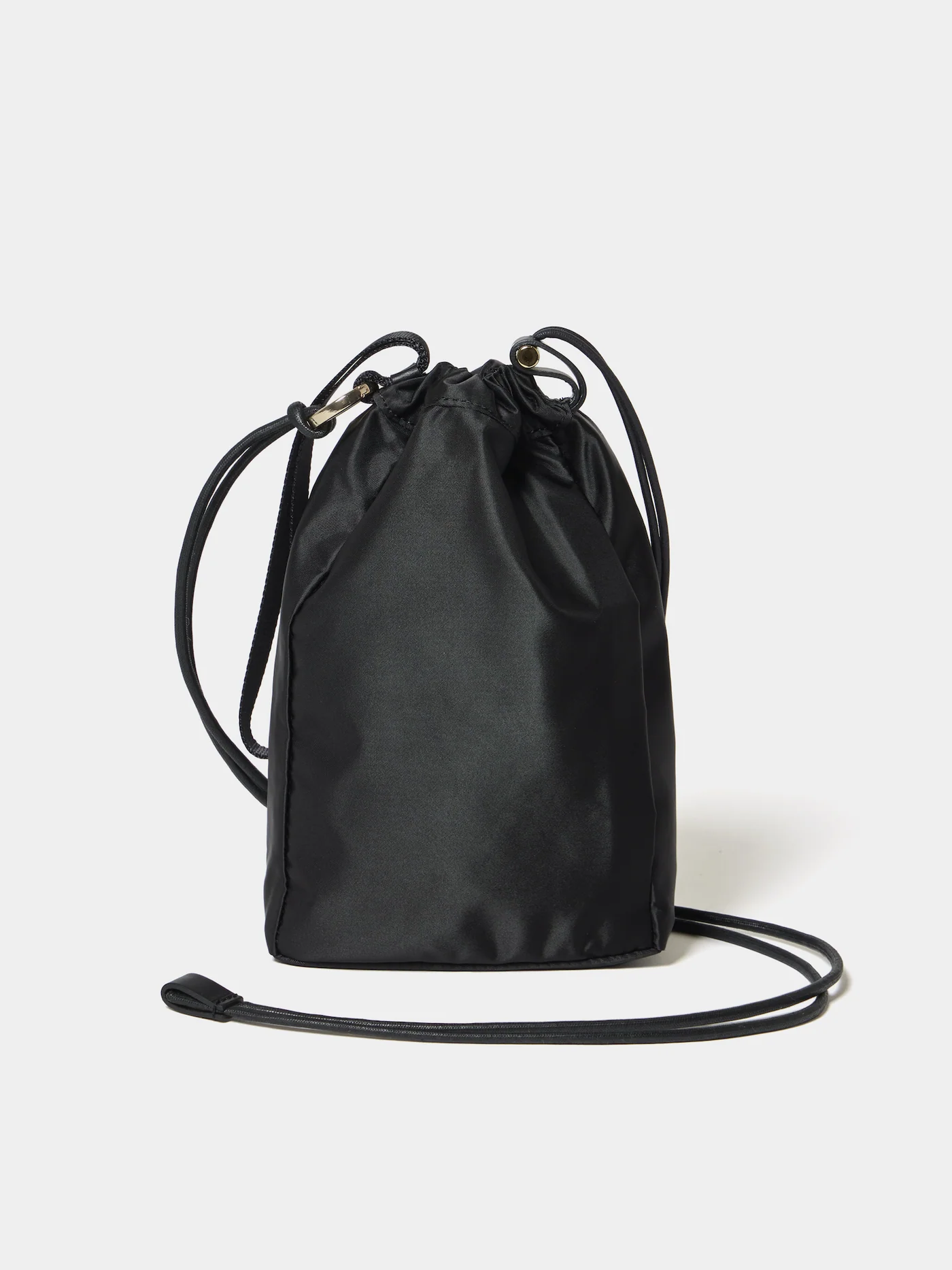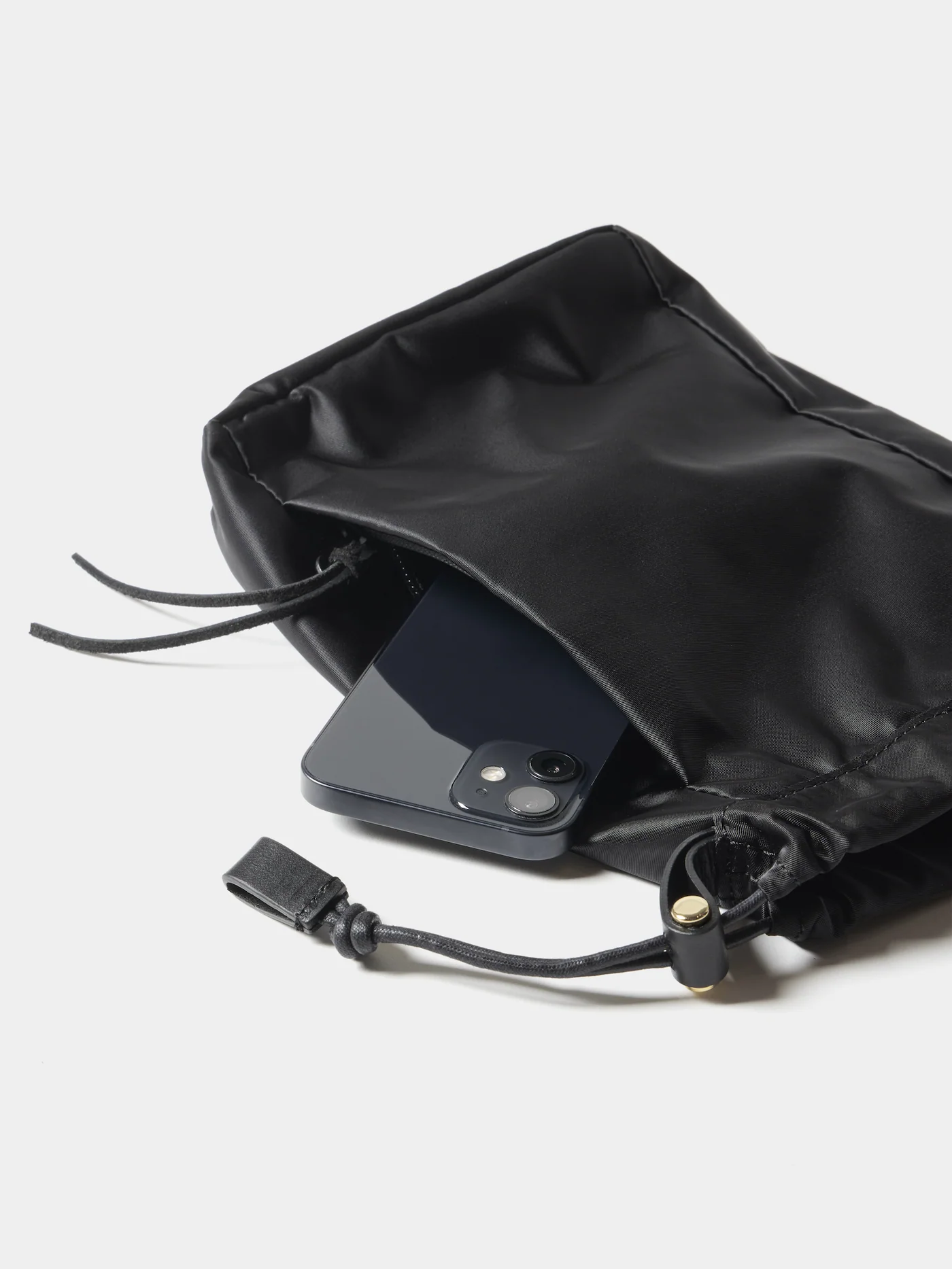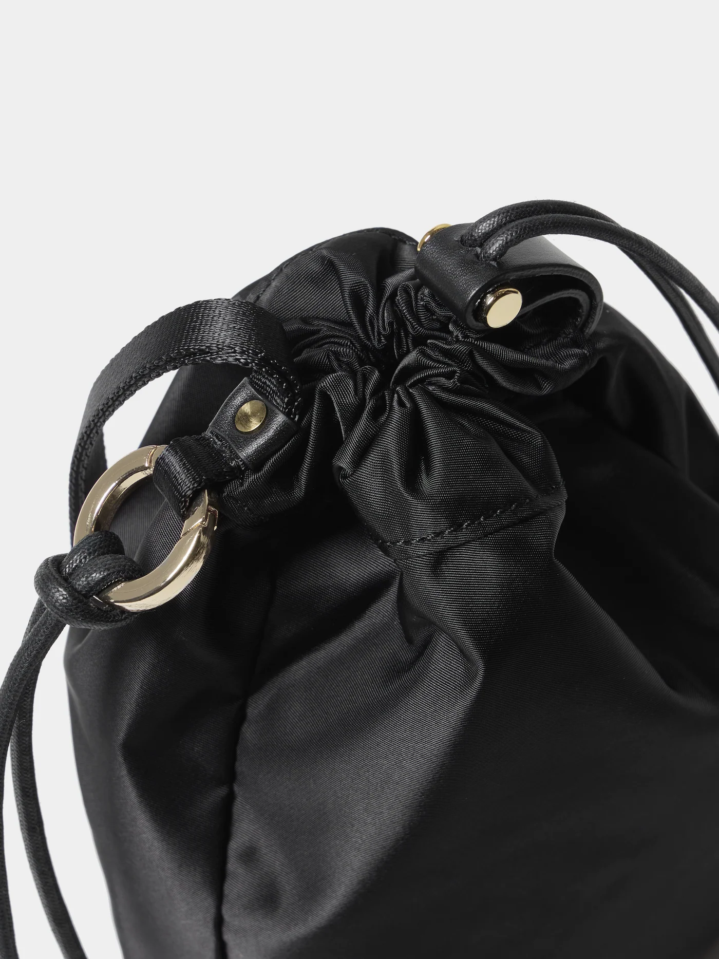 アウトドアで使われるドローストリングシステムを基に、口元を開閉する動作に無駄が無いように考え抜かれて配置されているストラップや金具パーツが特徴。
