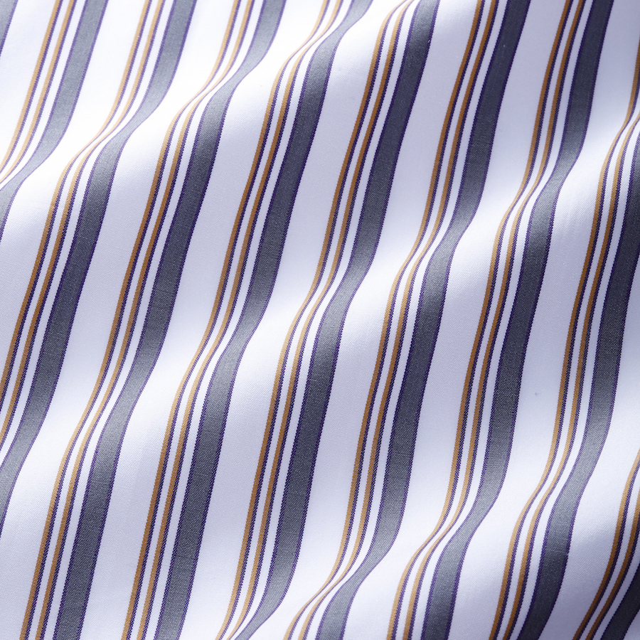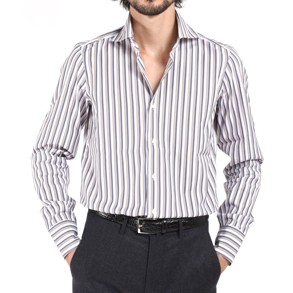 ストライプ幅が広めで主張が強めなので、他のアイテムでシャツの色を拾ってあげてると馴染みの良いコーディネートになると思います。
