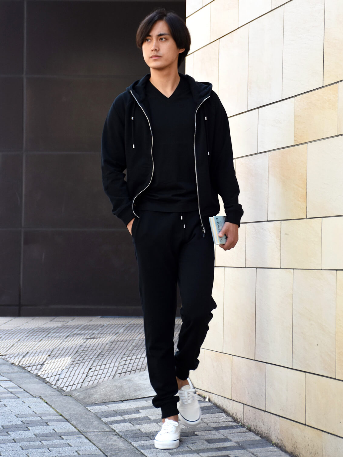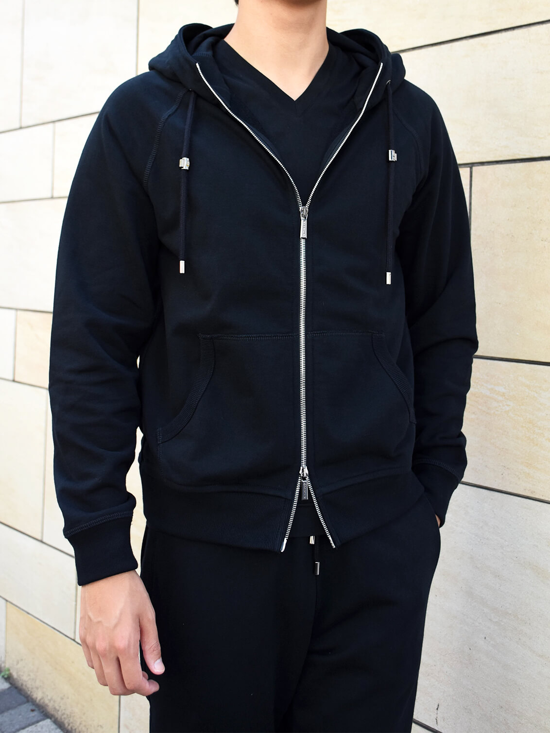 ・ブラックを着用し、ブラックのスウェットセットアップを合わせたスタイル/ 身長180センチ/体重70キロで、着用サイズは46です。