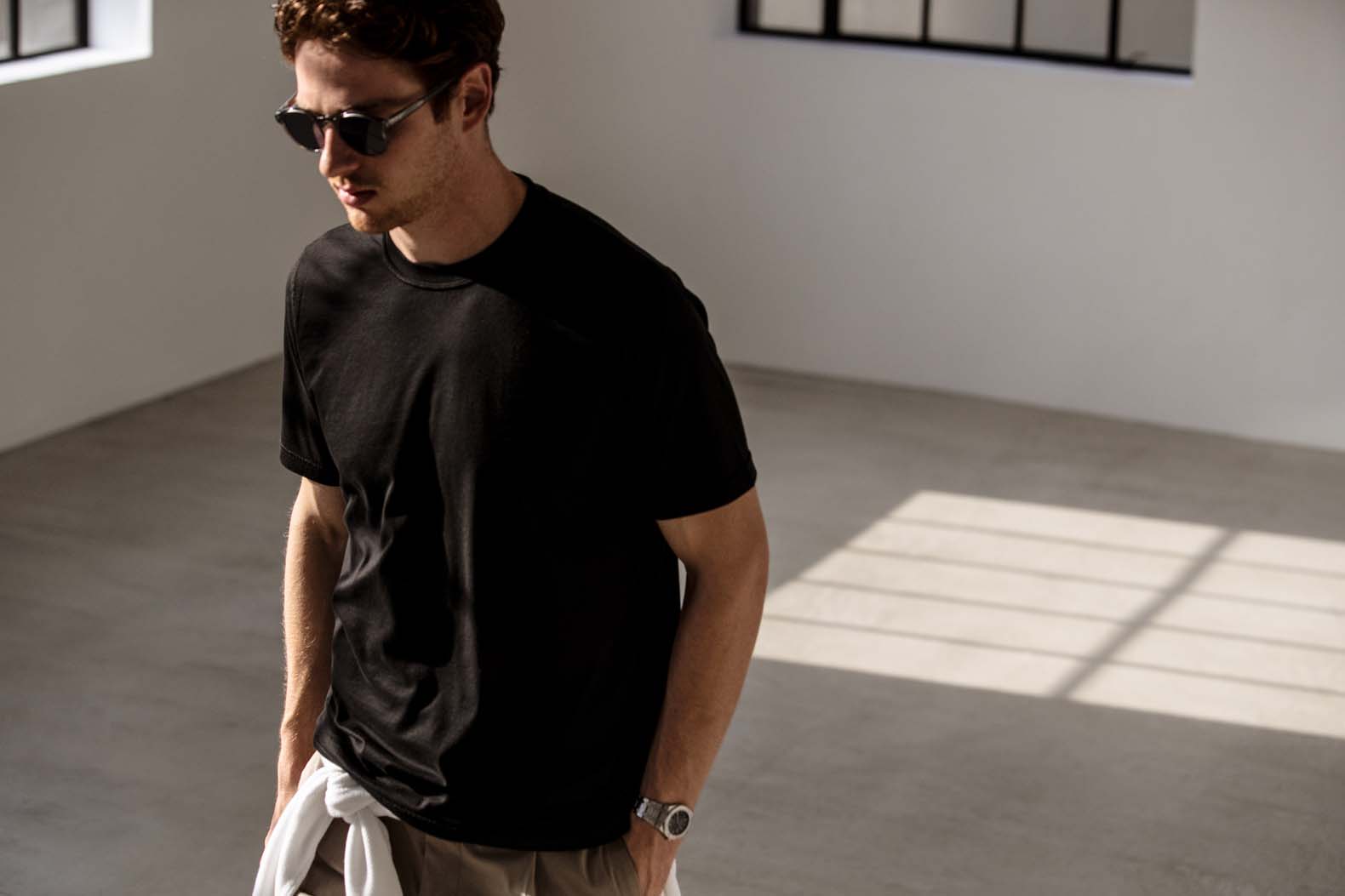 ・ネックの開き具合は、Vネックの特徴であるシャープさは残しながら、一枚でも着られる程よい具合に設定されています。