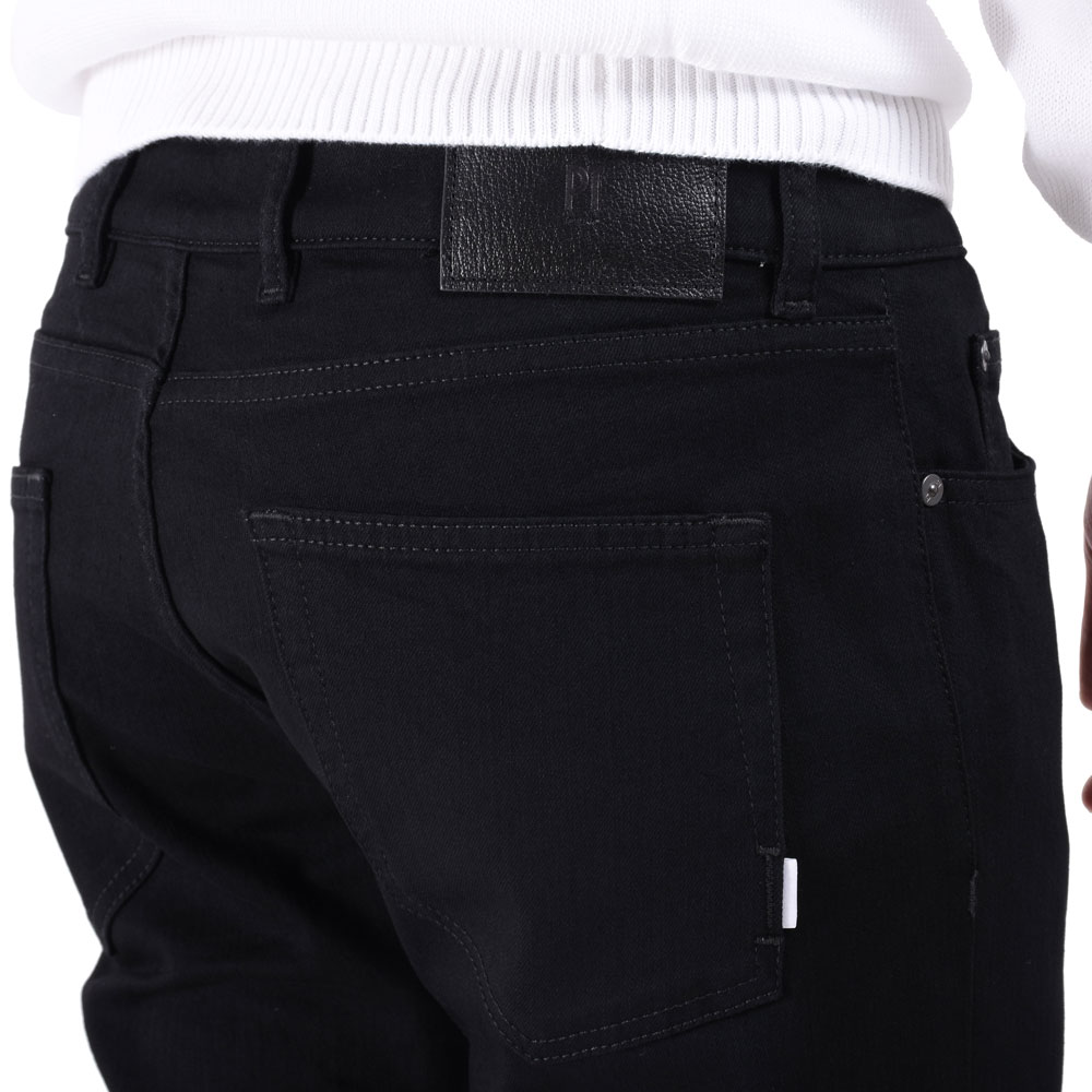 ・リベットとフロントボタンはガンメタ、それ以外はステッチ、レザーパッチもブラックで統一された黒の色合いが際立つストイックな一本。