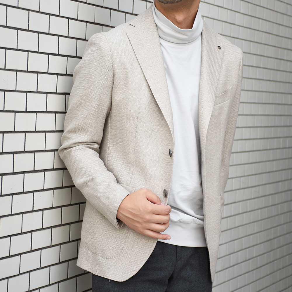 クセのない自然なフィット感でハイゲージのニットと合わせてもバランスよく着られるちょうどいいサイズ感。袖通しもスムーズで軽やかさのある着用感です。見た目にも軽さがあり、堅すぎず程よくリラックスした雰囲気。タイドアップではきちんと感が出せて、ニットなどで抜け感のある上品なカジュアルとしても着られる万能ジャケットです。まずは押さえておくべき一着かと。足元のチョイス次第で印象も大きく変わる、汎用性の高さも大きな魅力です。