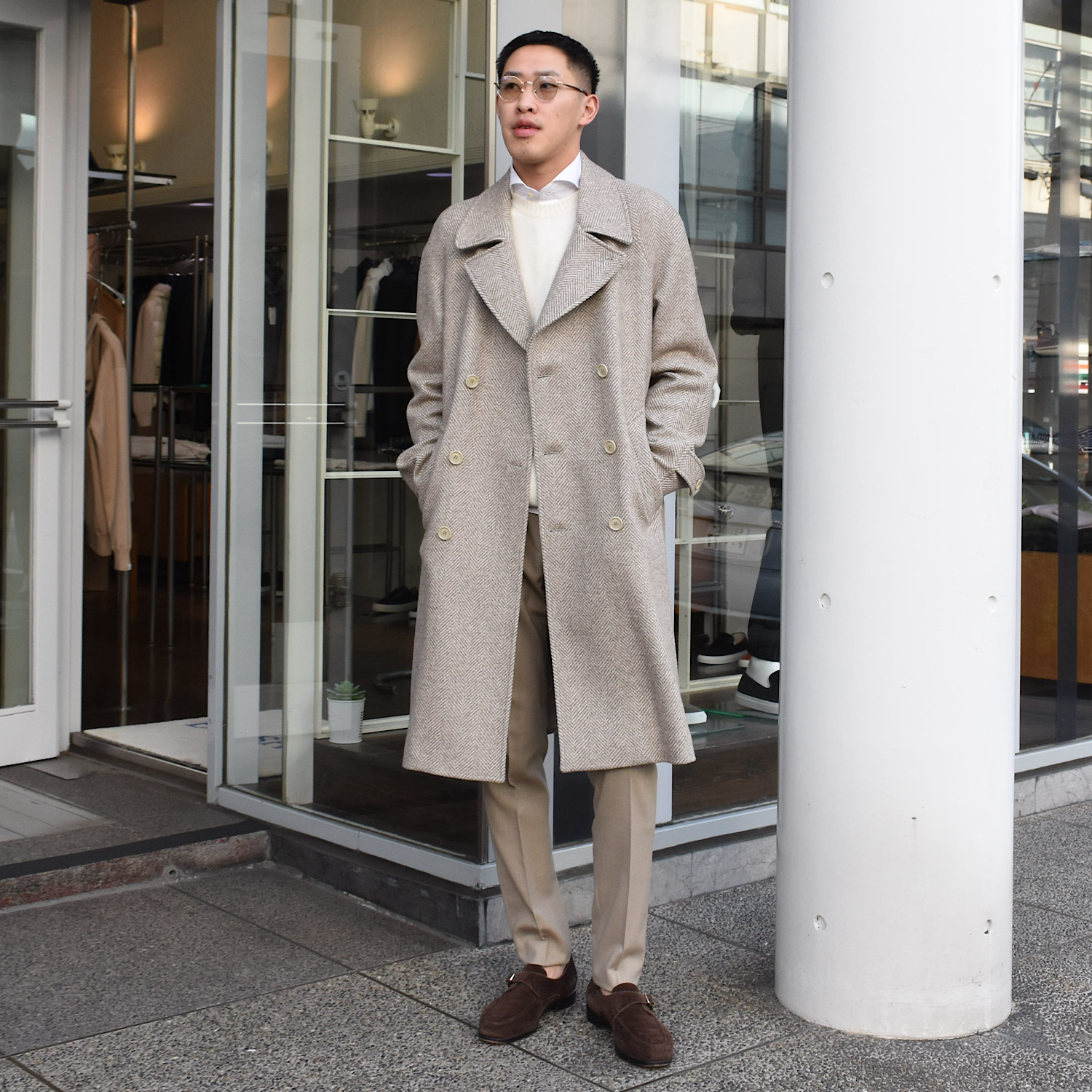 ・ナチュラルなベージュとグレーの配色が優しい雰囲気を醸すヘリンボーン生地は目付550グラムのウール&カシミア。