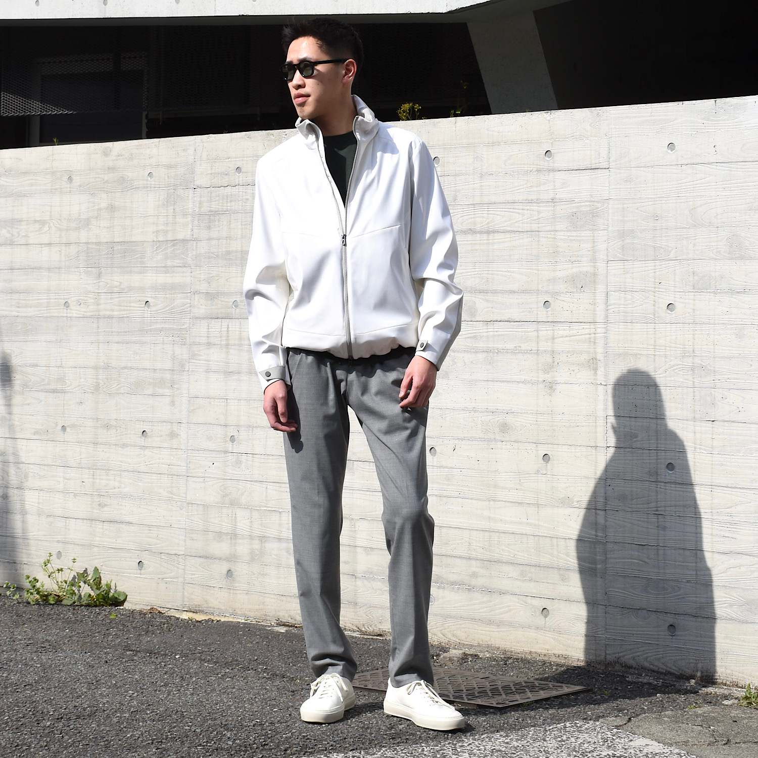 ・オフホワイトという色合いが目を惹くクリーンな色合いのアウターシェル、スタンドカラー周りや袖に用いられたライトグレーのアルカンターラ、それらにトーンを合わせたジップといった配色が機能的なジャケットに洗練されたムードをもたらします。