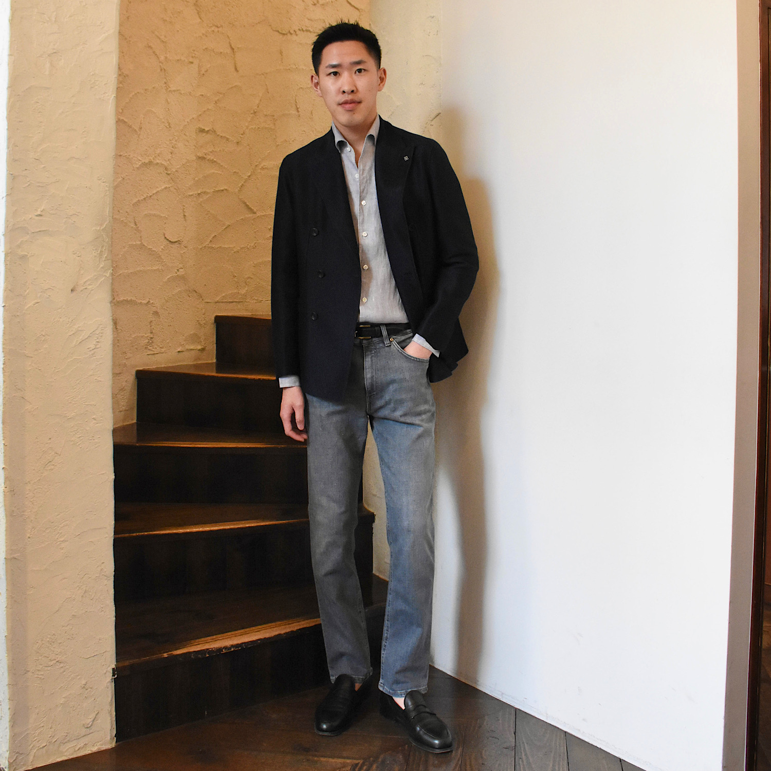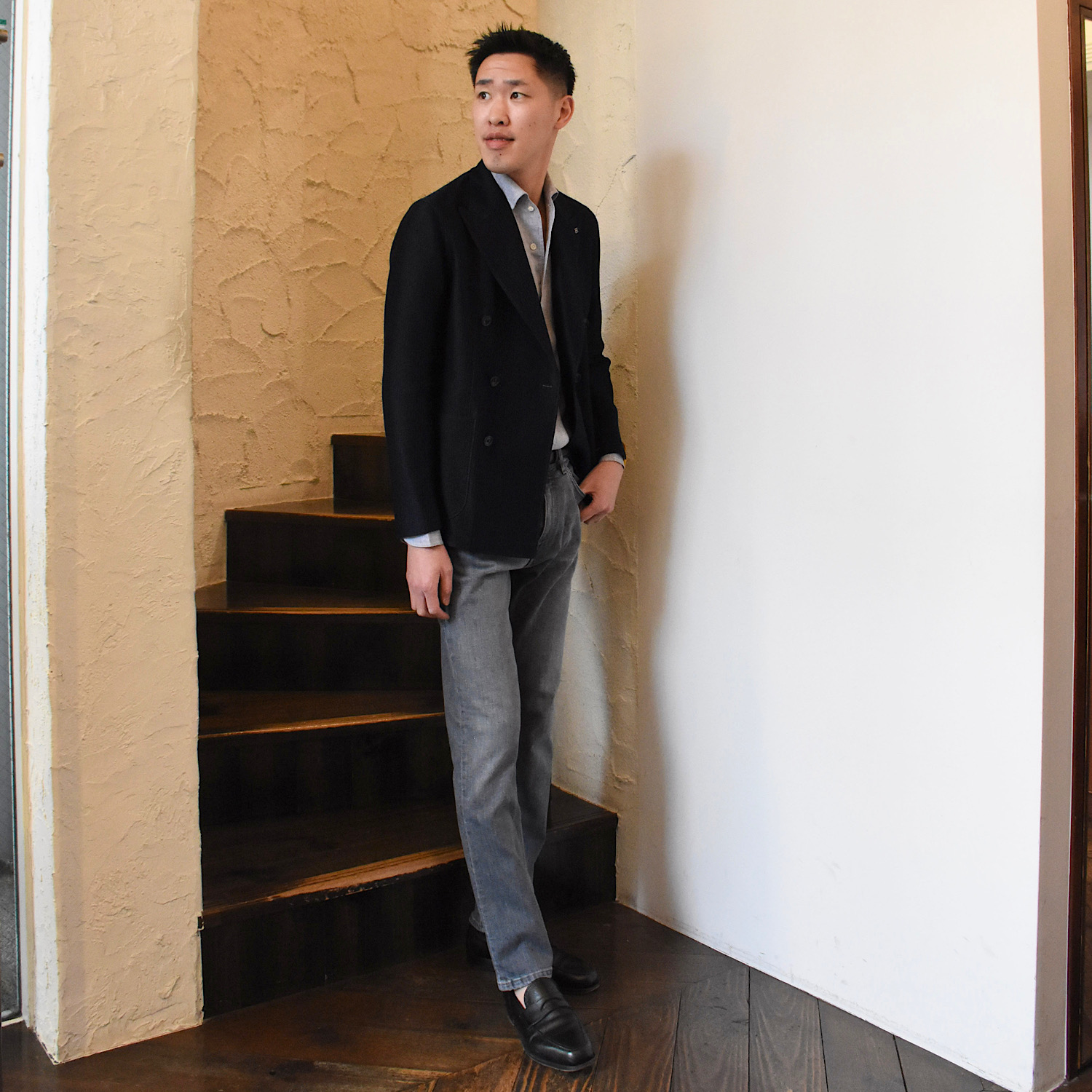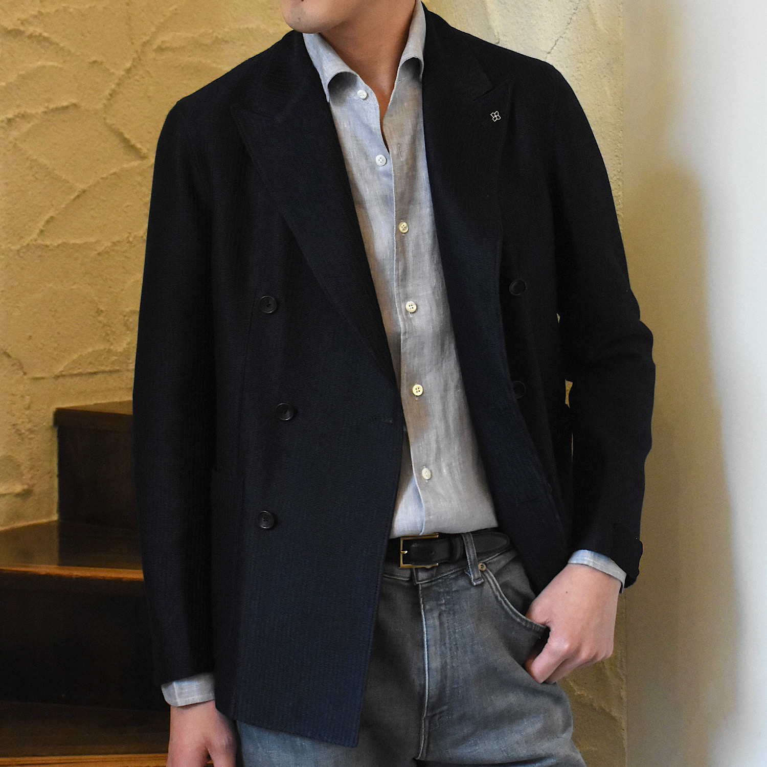 ・モデルは「TAGLIATORE(タリアトーレ)」の中で最も軽い仕立ての"LIGHT"。柔らかな仕上がりのため、ジャージーなどのカジュアルな生地にピッタリです。