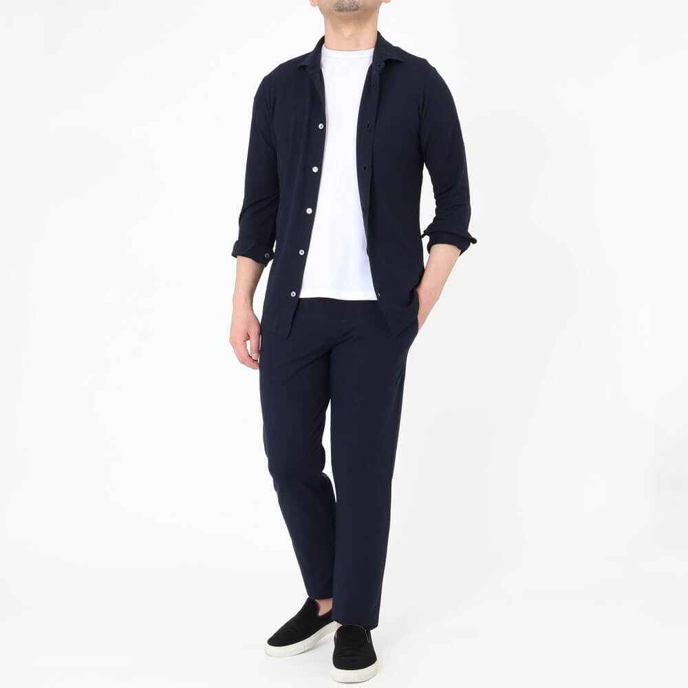 ・布帛のシャツのように、そして羽織物として着られるのがジャージーシャツの便利なところ。リラックス感があり仕事や移動時にもピッタリです。ベーシックな3色でご用意しました。ネイビーのみセットアップとして穿けるパンツもラインナップ。