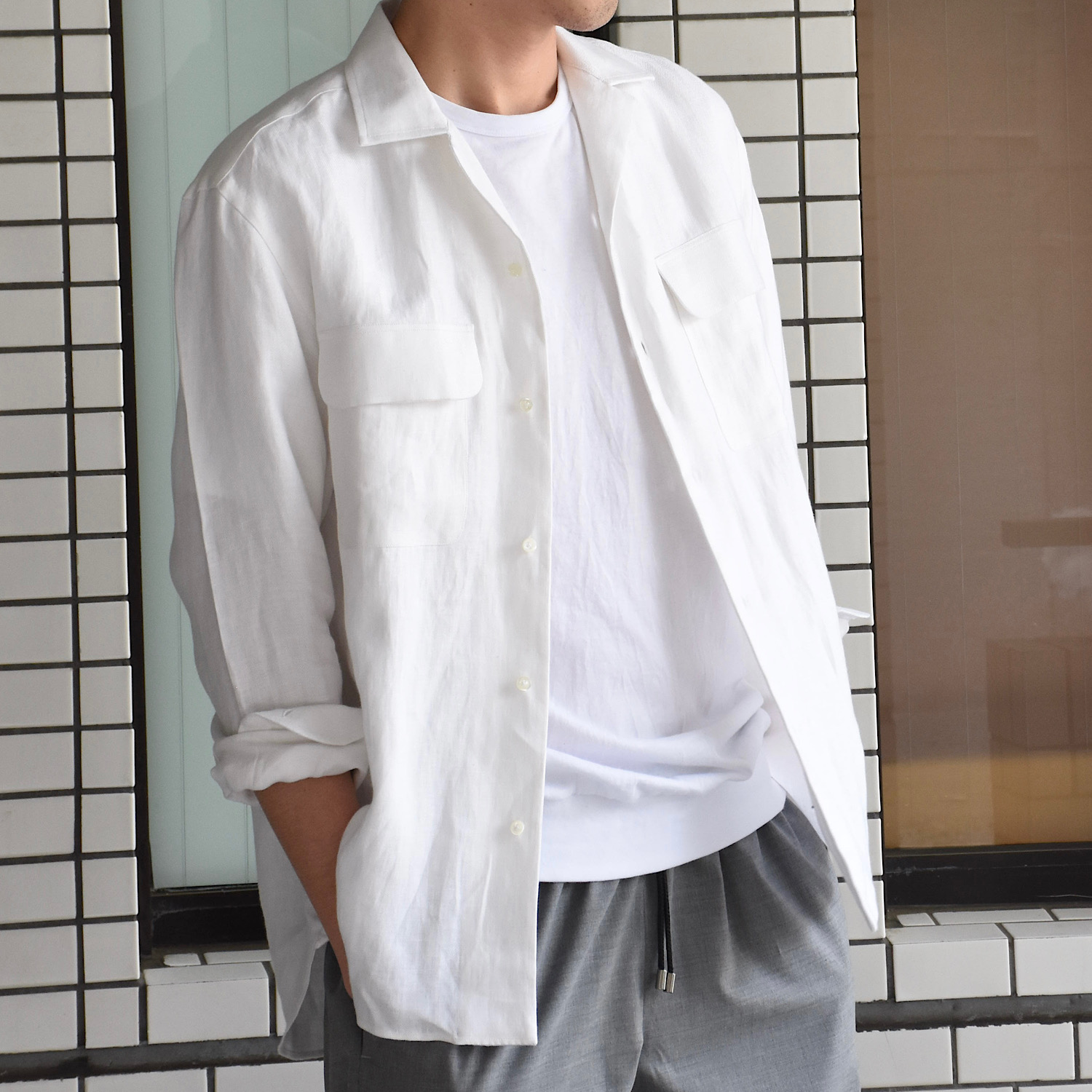 ・生地はしっかり感のあるツイル(綾織り)リネン100%。オーバーシャツ用に用意されている生地のため、羽織るのに適したほどよい厚みです。着用する度に馴染む風合いの良さが楽しめます。全3色(ブラウンベージュ)のラインナップ。
