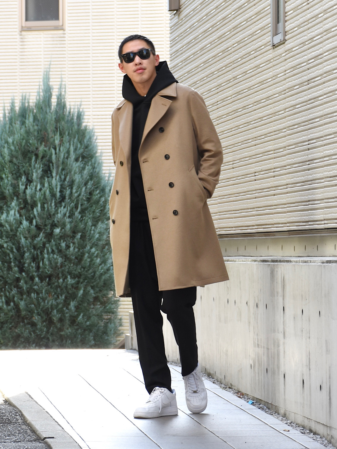 キャメルのダブルコートにパーカーを合わせたモダンなスタイル。上品×カジュアルのバランスが◎