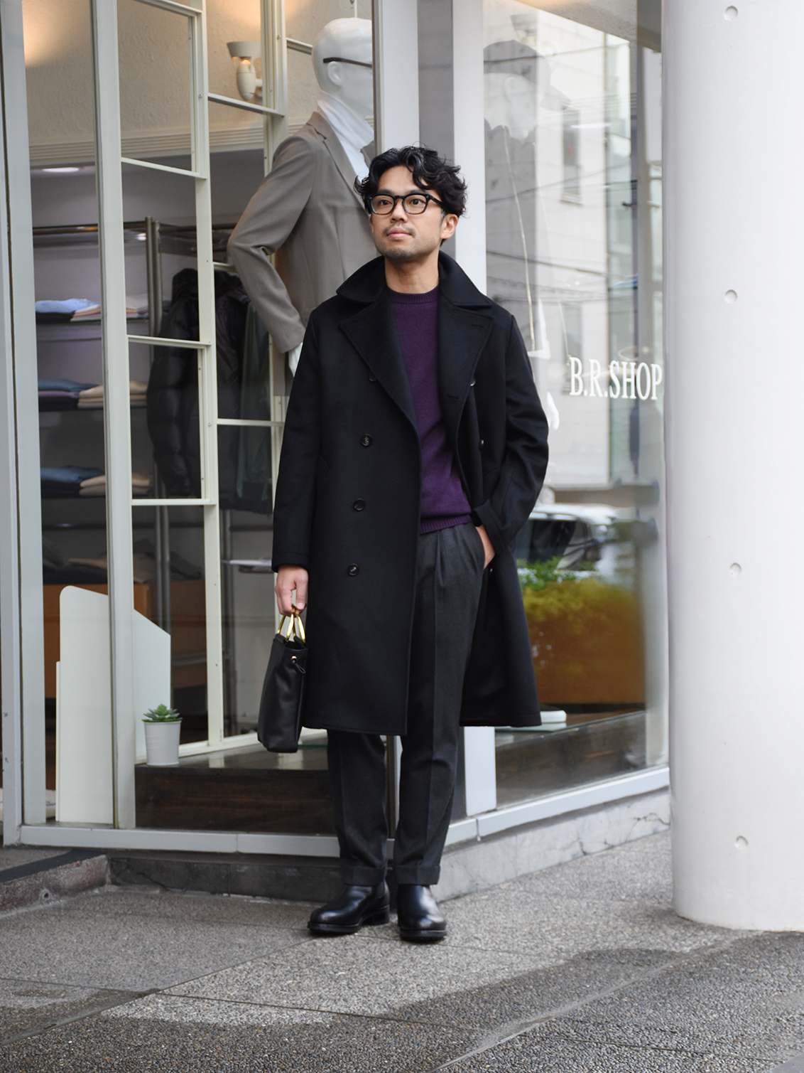 またまたダブルコートの登場。美しいシルエットのブラックコートにパープルを合わせた落ち着いたスタイル。挿し色を入れる事でワンランク上のコーデに。