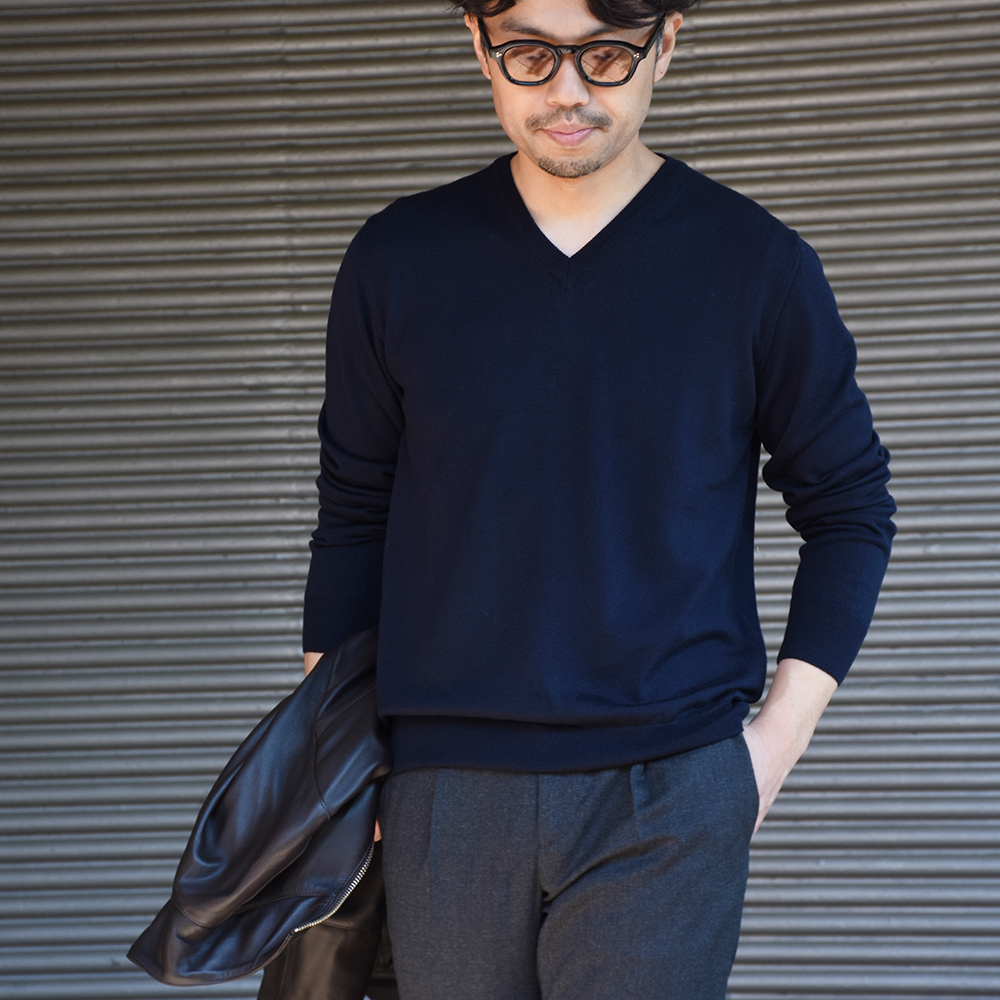 Vネックは顔周りをすっきりと見せてくれる優秀なアイテムです。