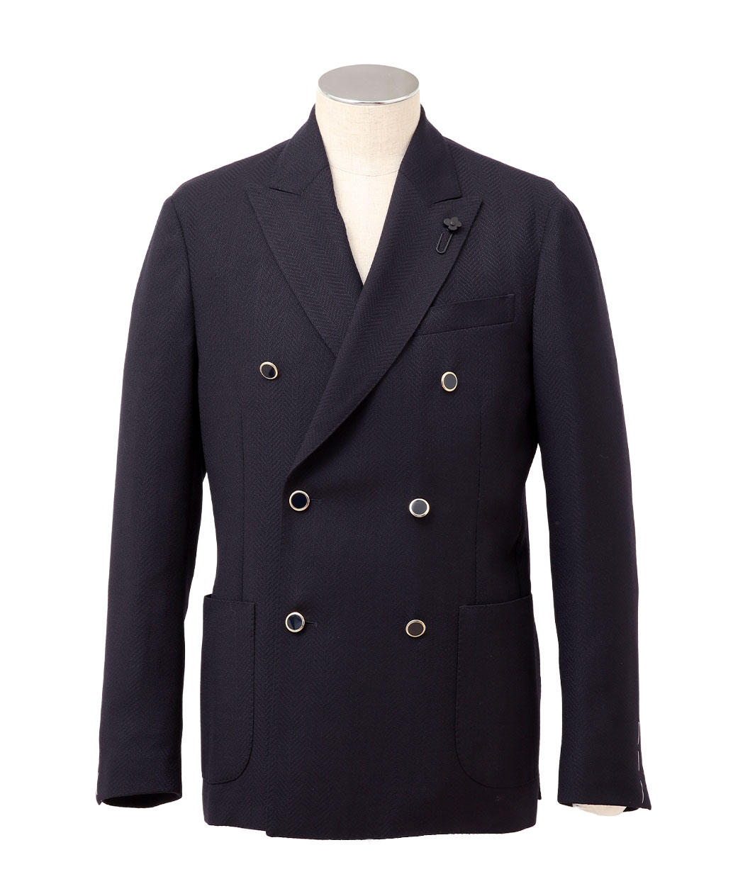 光沢感が美しく柔らかな生地で仕立てたメタルボタンが映えるダブルブレストジャケット。