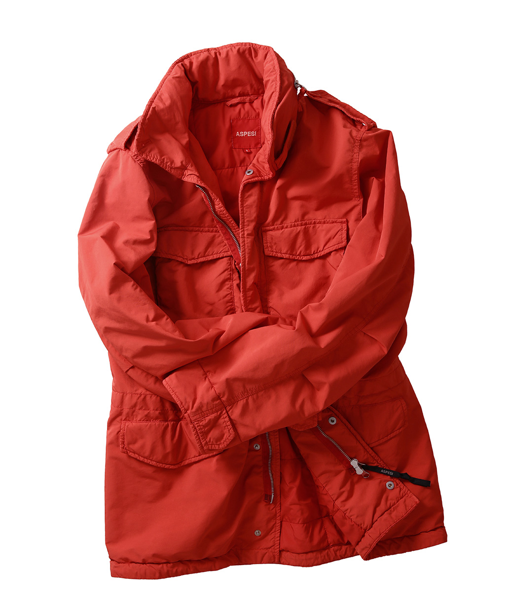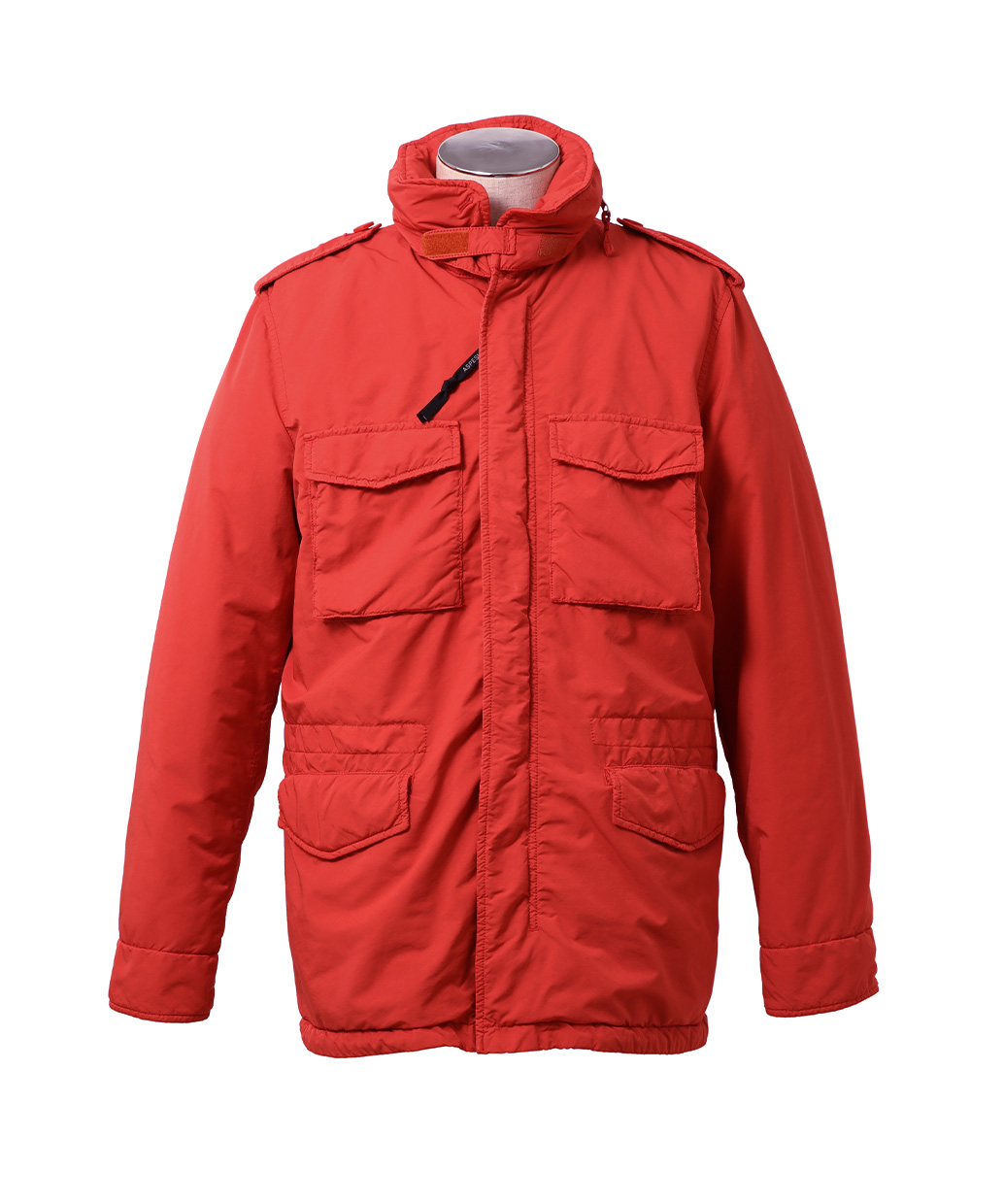 ポリエステルの糸で緊密に織りあげた生地に熱処理を加えて織り目を潰すことで雨や風に強いハイテク素材を使ったジャケット。デザインはミリタリースタイルのM-65のスタイルを踏襲した立ち襟のハーフ丈モデル。ミニフィールドモデルに比べ身幅・着丈共に大きめに設定されています。 フラップ付きの4ポケットデザインは機能的かつ洗練られたデザインで、男臭さい雰囲気を演出するのにピッタリなアイテムとなっています。薄めの中綿が入った固定ライニングが重ね着を可能にしカジュアルスタイルはもちろん、ジャケットスタイルと組み合わせれば定番のミラノスタイルが出来上がります。