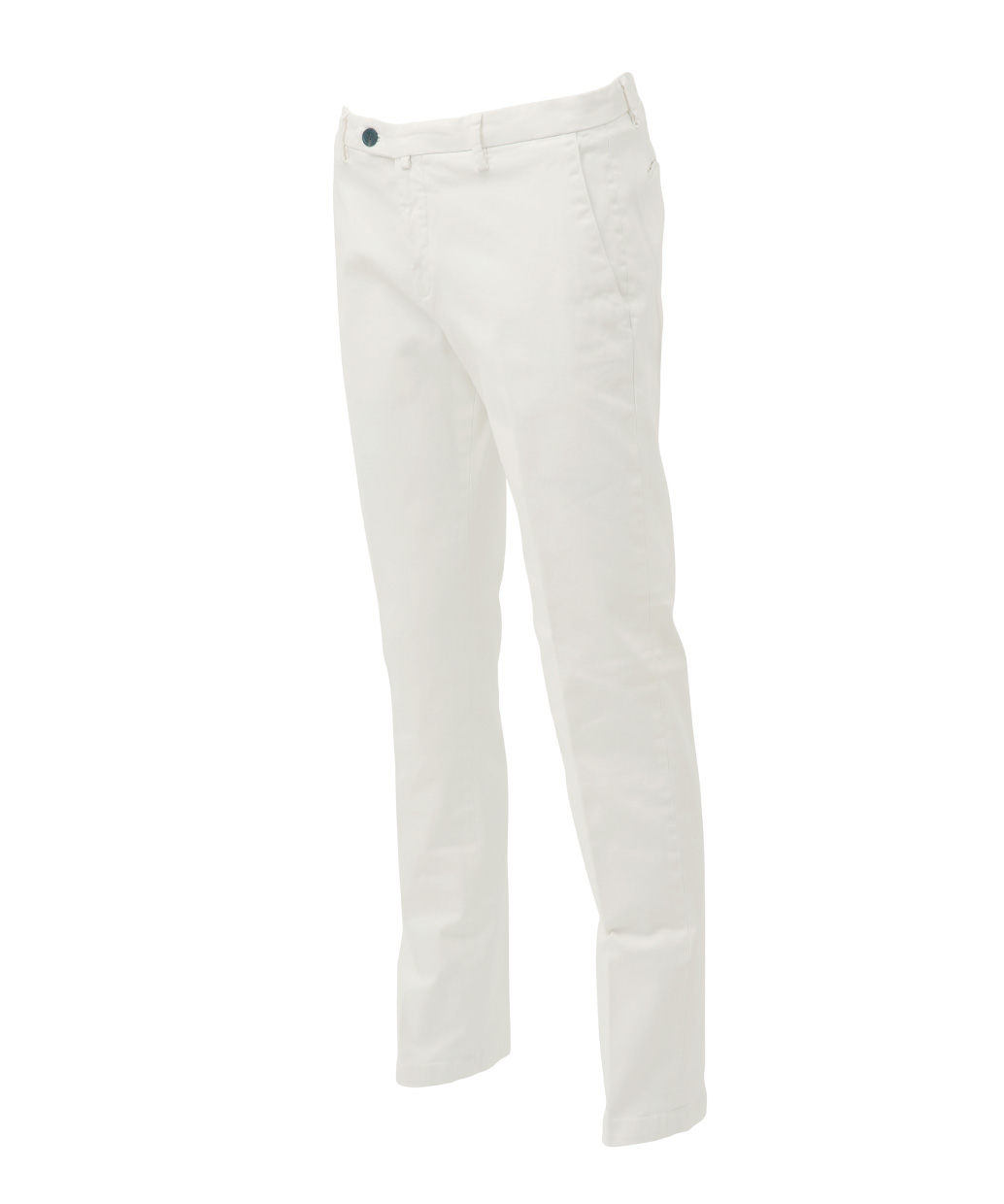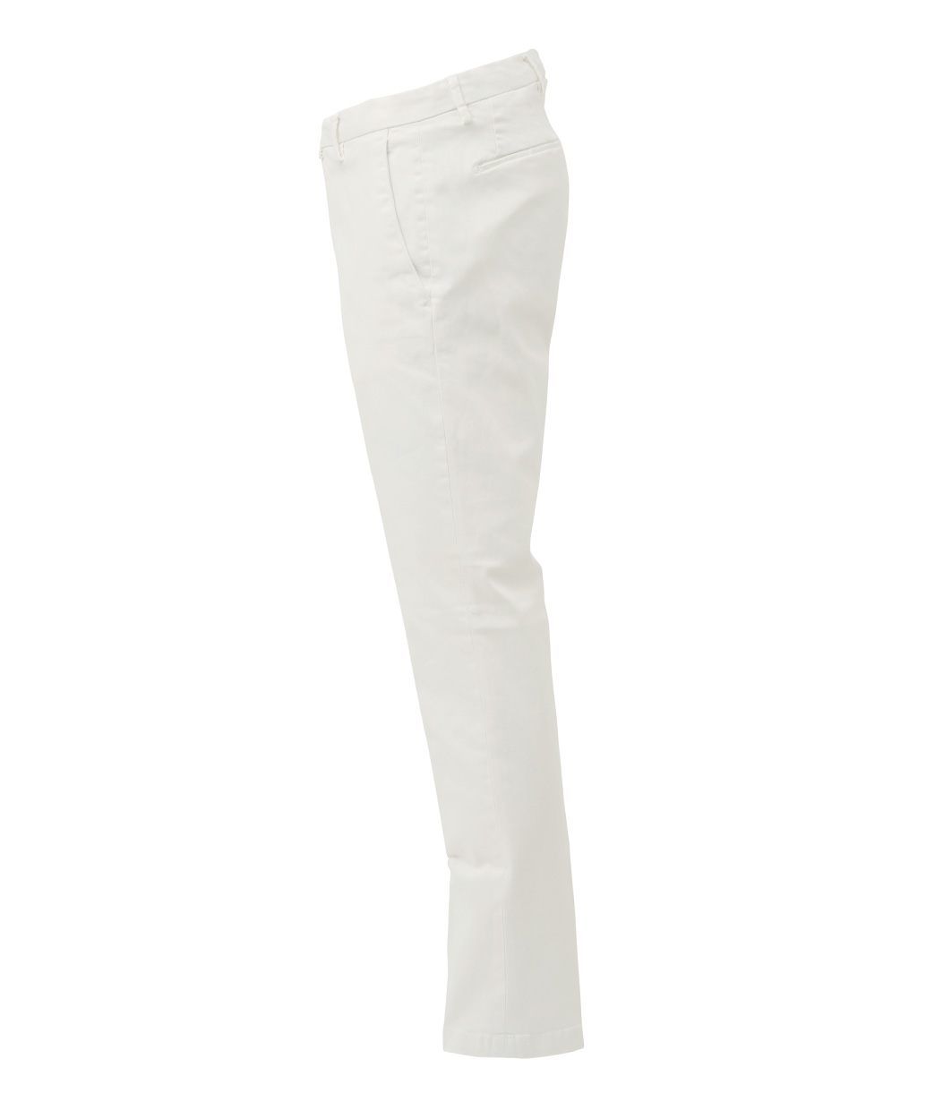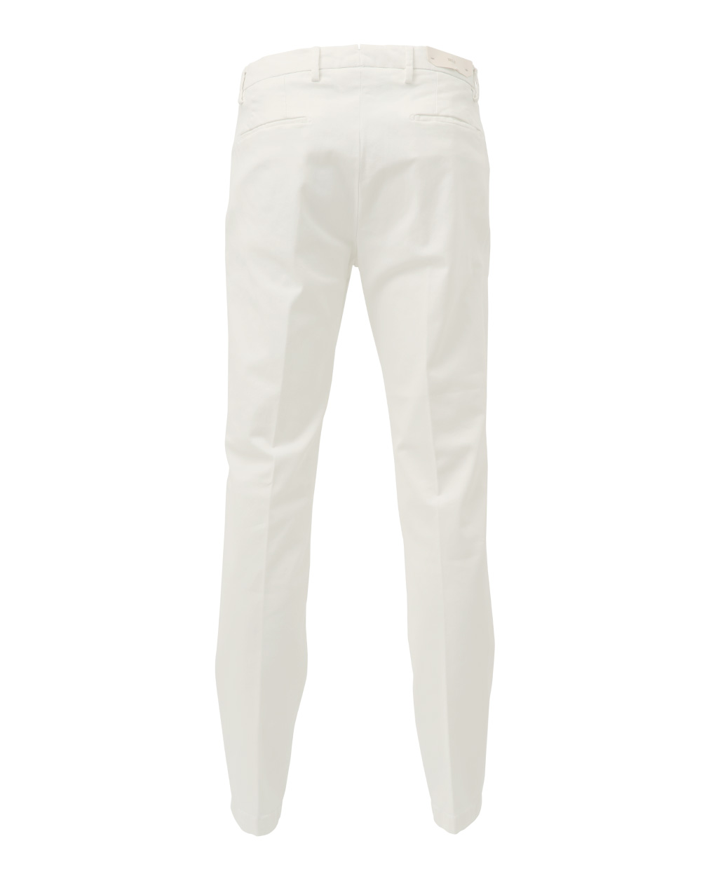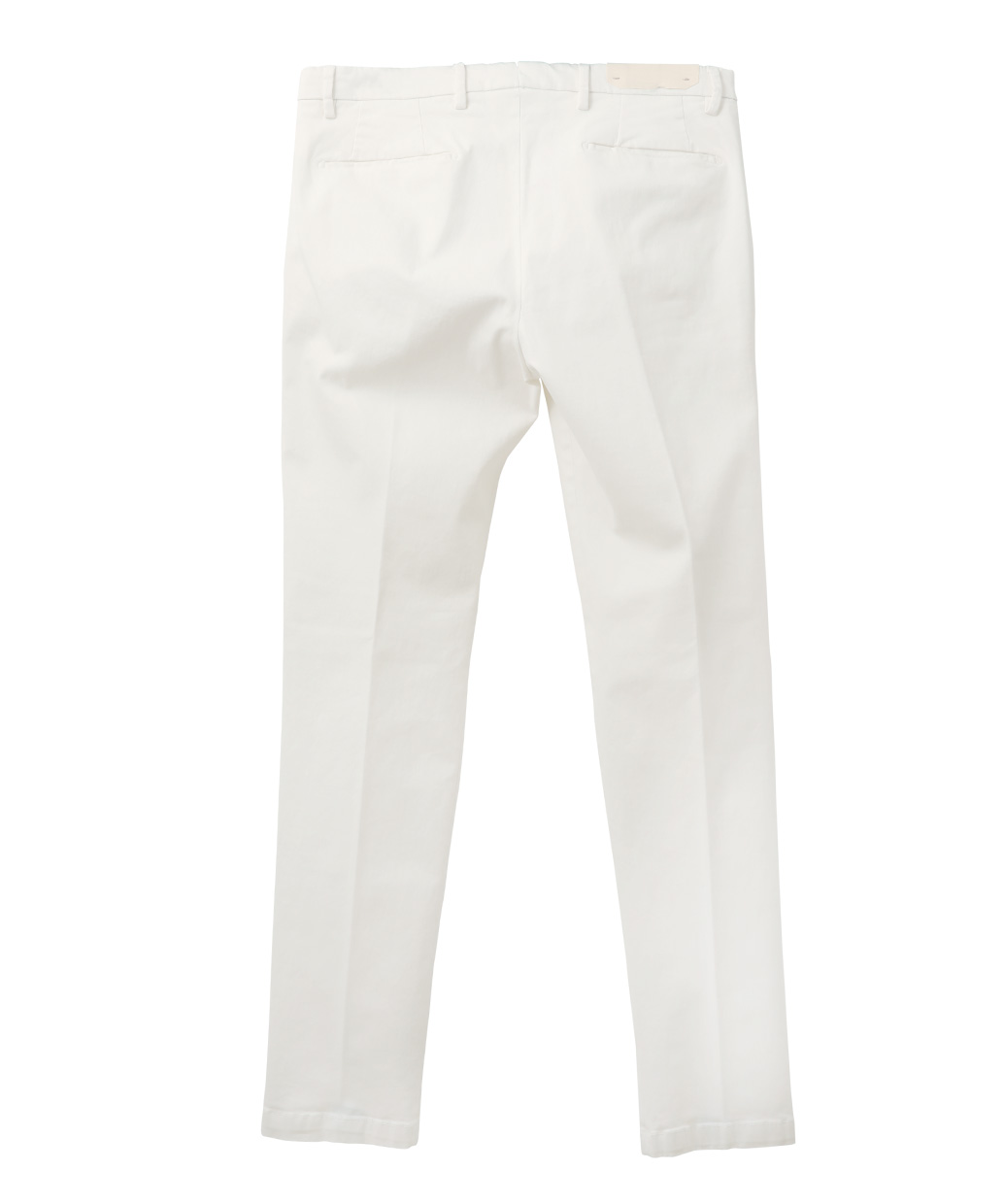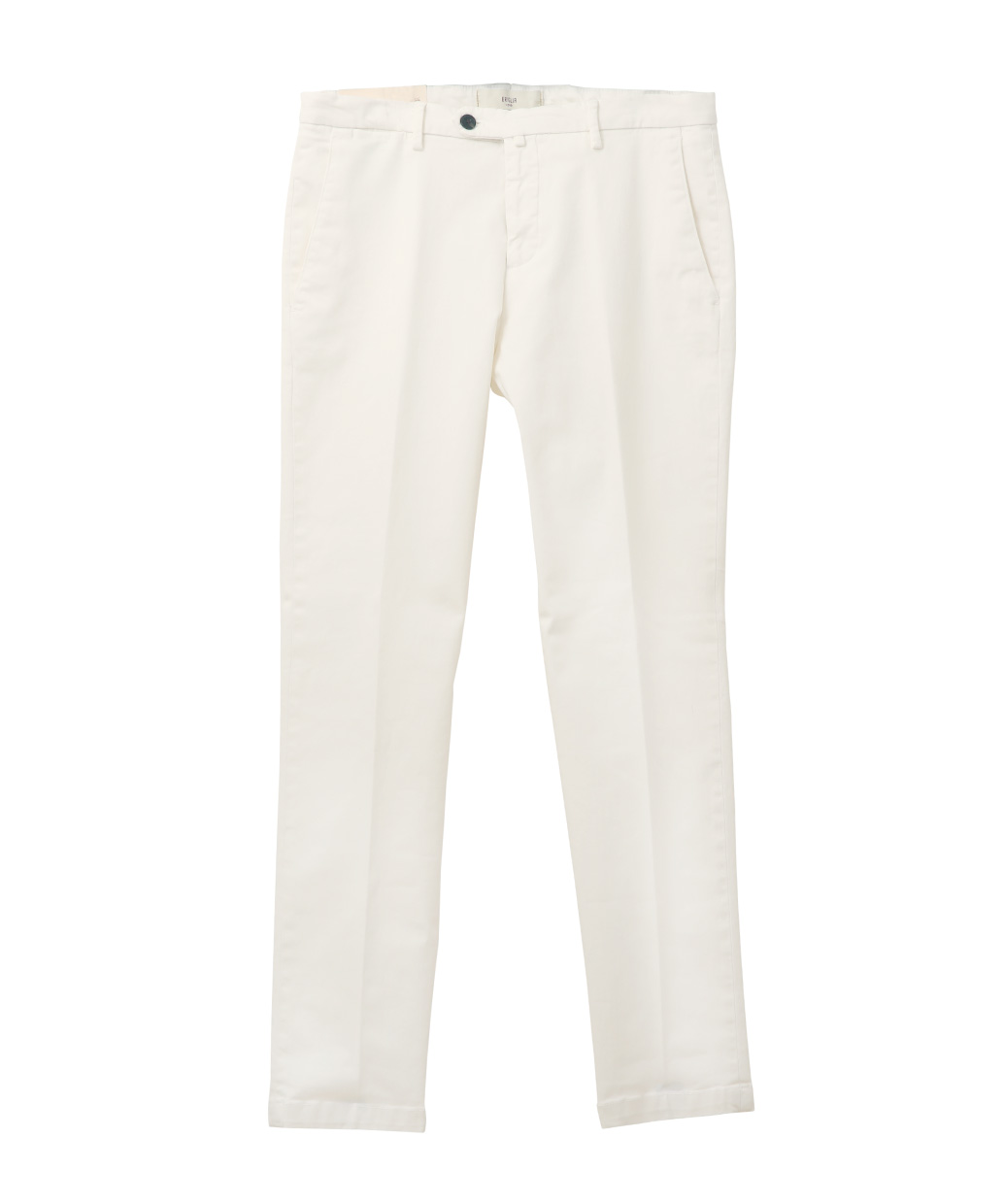 コットンにポリウレタンを混紡したツイル生地を使用し適度なストレッチ性と肌なじみの良さを兼ね備えた一本です。ノープリーツのフロントにスリムシルエットを採用することで、すっきりとした印象に仕上げています。カジュアルからジャケットスタイルまで幅広く活躍してくれる、汎用性の高い大人のためのコットンパンツです。