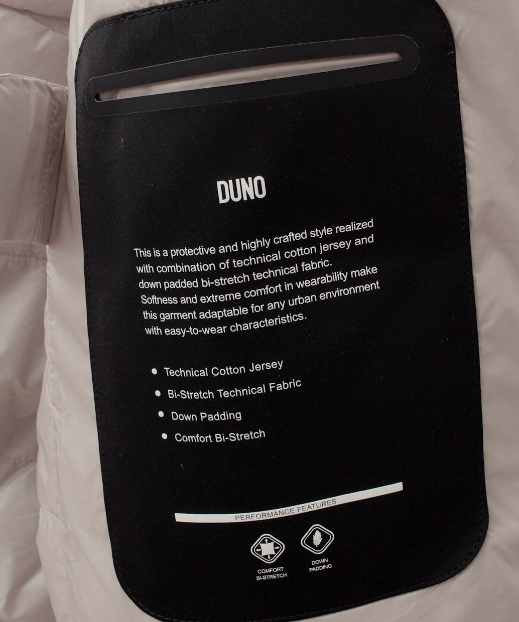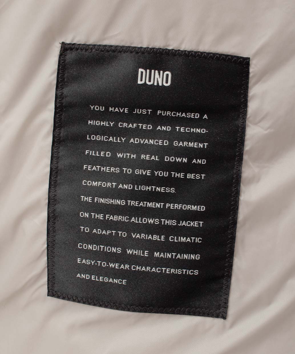 DUNO〈デュノ〉は、2012年にフィレンツェのエンポリで誕生した、グローバルでコンテンポラリーな新しいコンセプトのアウターウェアブランド。上質な素材と先端技術、現代のライフスタイルと伝統的なイタリアンテイラリング技術の融合によって産み出されたDUNOは、防風、撥水性に優れた機能的な素材を使用し、羽抜を防ぐダブルパックに上質なダウンが詰められています。