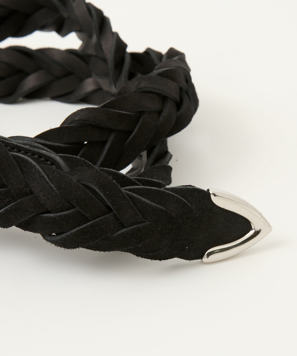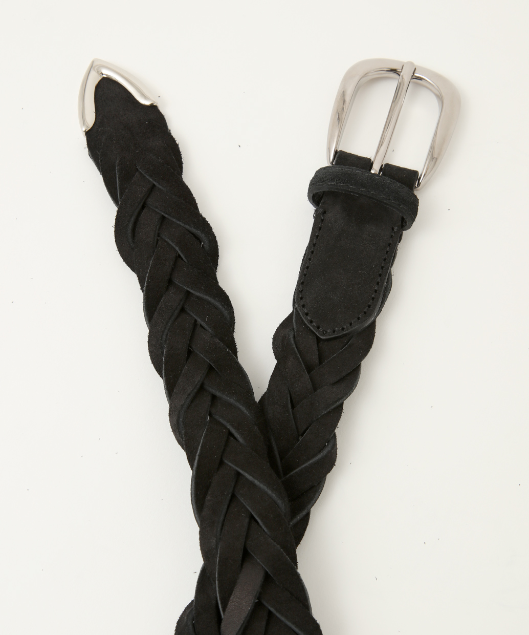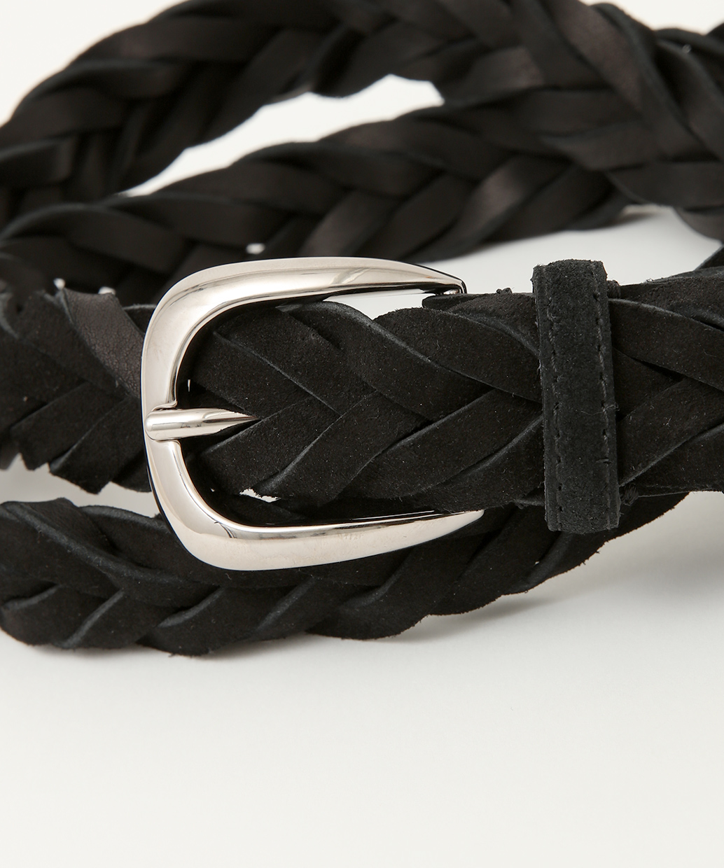 柔らかなスウェードレザーを上品に編み上げた、表情豊かなメッシュベルト。起毛感のある素材がコーディネートに奥行きを与え、ほどよく力の抜けた大人の雰囲気を演出します。ラウンドフォルムの真鍮製バックルと先端のプンターレがきちんと感をキープしてくれるため、ジャケットスタイルやキレイめカジュアルにも相性抜群です。