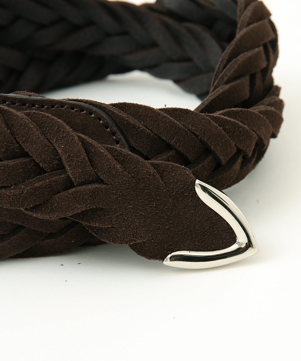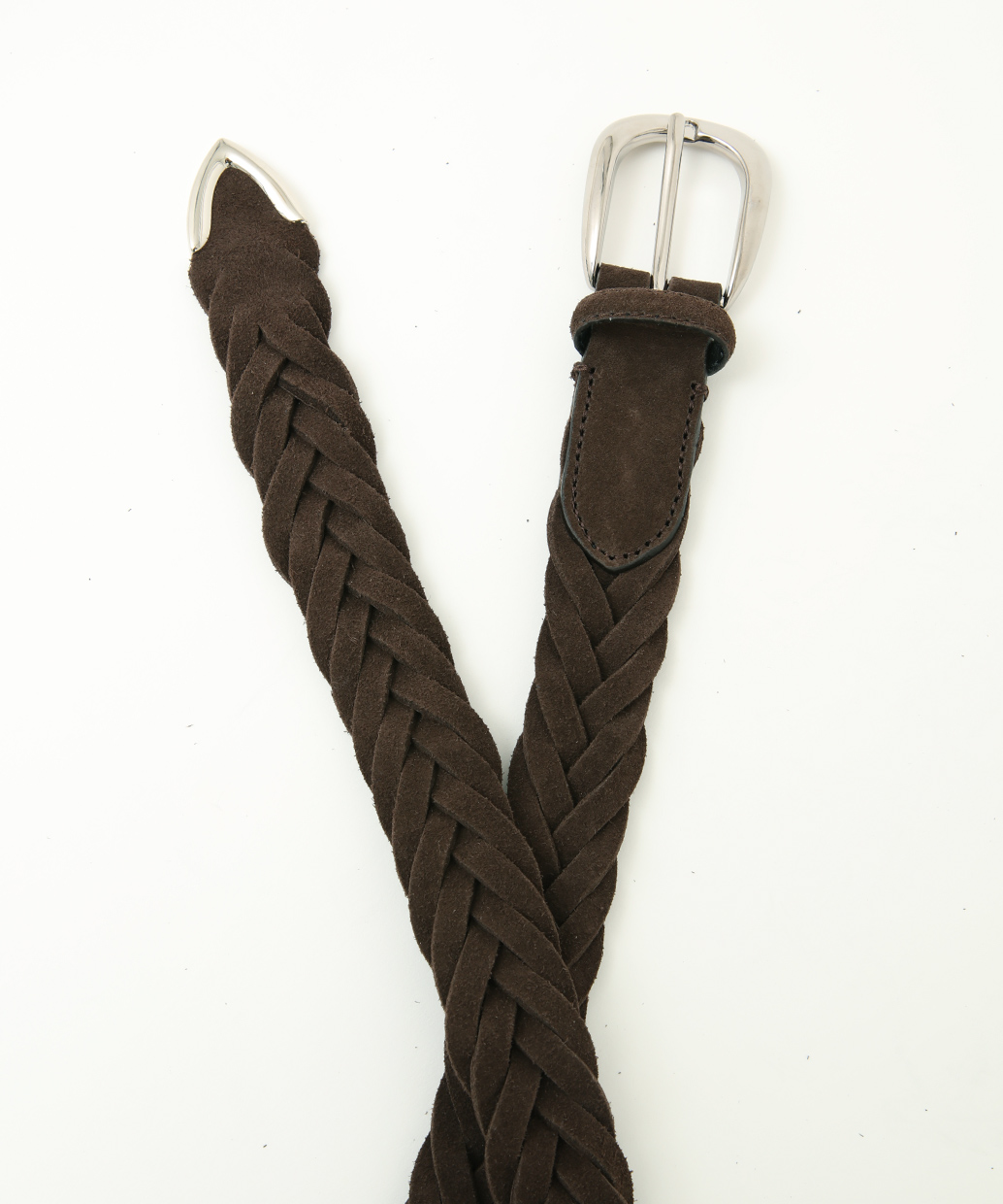 柔らかなスウェードレザーを上品に編み上げた、表情豊かなメッシュベルト。起毛感のある素材がコーディネートに奥行きを与え、ほどよく力の抜けた大人の雰囲気を演出します。ラウンドフォルムの真鍮製バックルと先端のプンターレがきちんと感をキープしてくれるため、ジャケットスタイルやキレイめカジュアルにも相性抜群です。