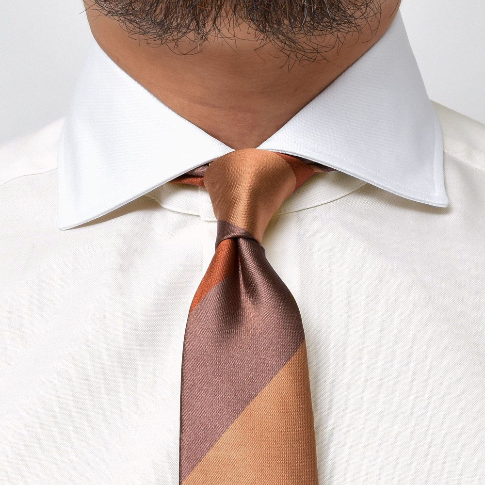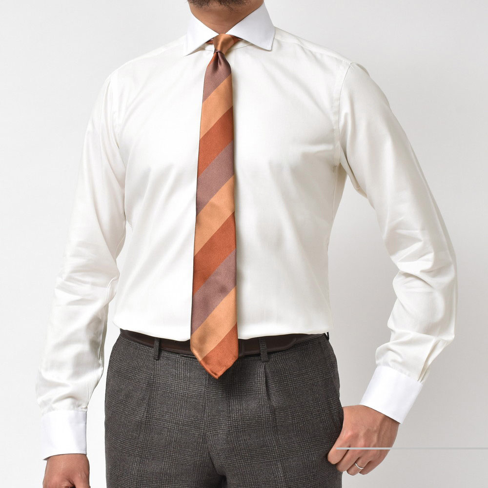 クレリックにする意味があまりない・・・と言えなくもないですが、なかなかどうして微妙なニュアンスをVゾーンに持ち込むことが出来ますので、ブラウンやベージュ系のジャケット、スーツにグラデーションを作るように
