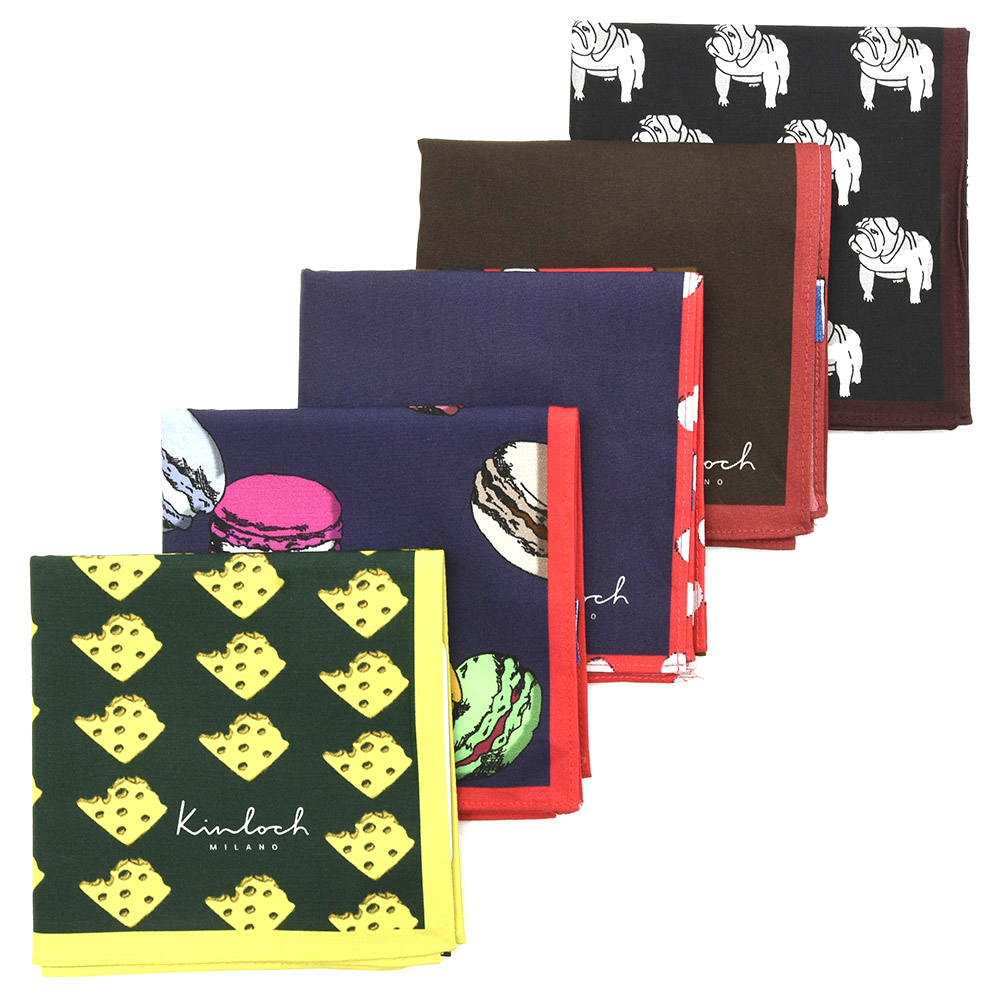 Kinloch(キンロック)の大ヒットアイテム・・・というと大げさですが、他にはない独特の配色と何となくキュートな柄出しで紳士のハートを掴んで離さないのがこのハンカチシリーズ。