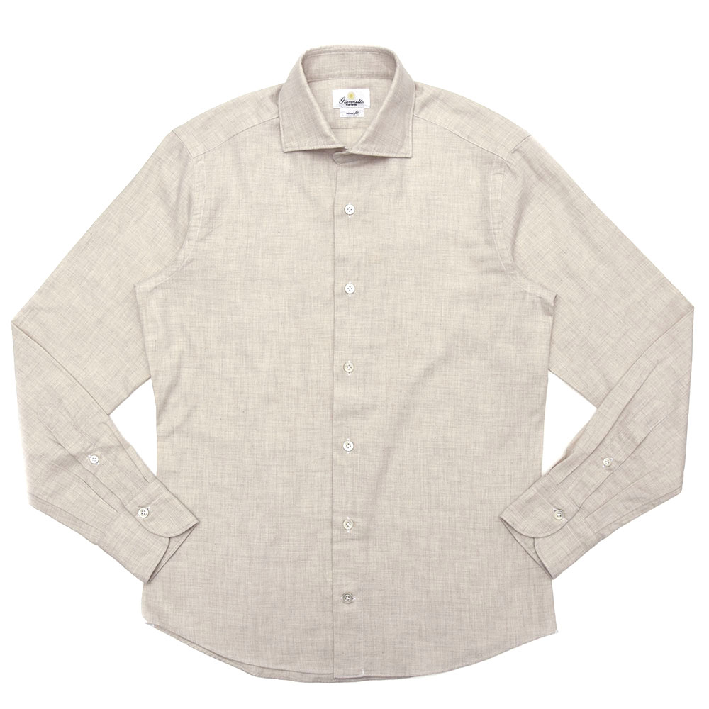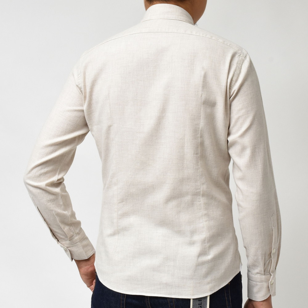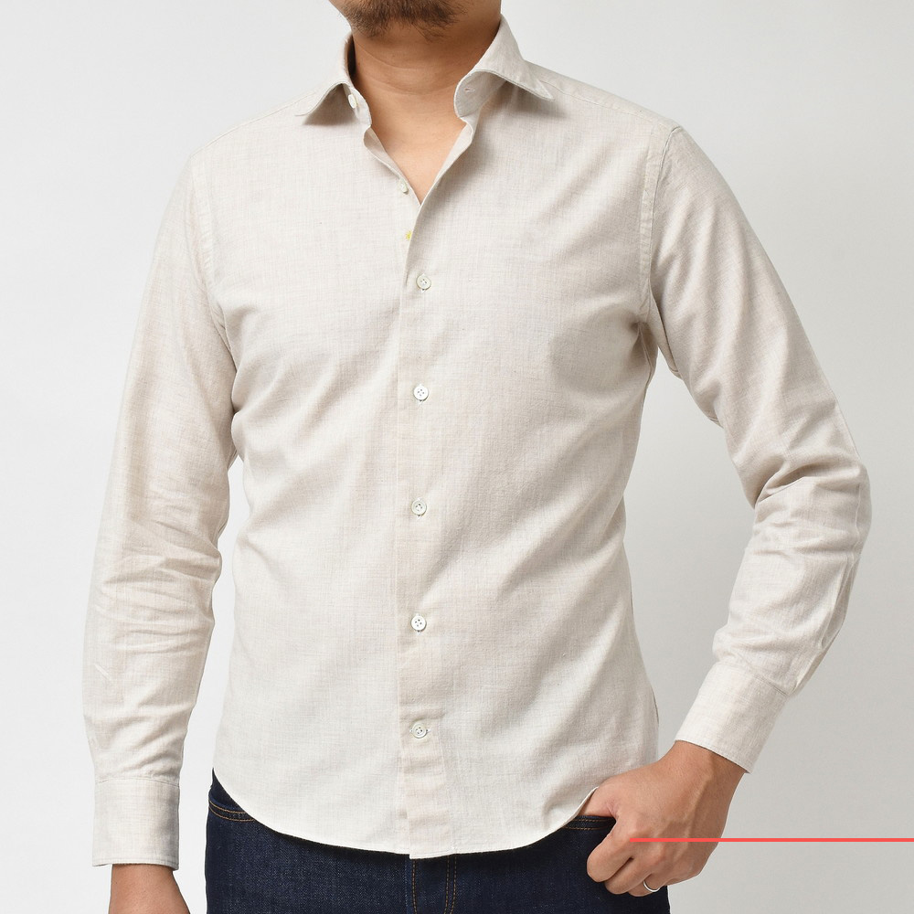 Giannetto(ジャンネット)の優しさあふれるコットンネルシャツはベージュカラーをベースにほんのり杢調のメランジ発色を採用したクリーミーモデルです。