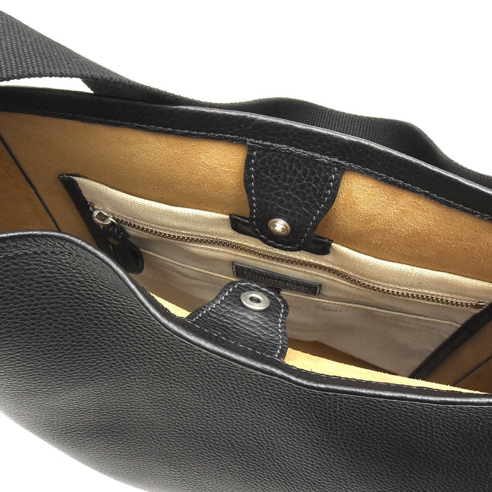 開口部を広めにすることで荷物の出し入れも容易ですし、スナップボタンを配することで防寒性もアップ。よく考えられているバッグだと思います。