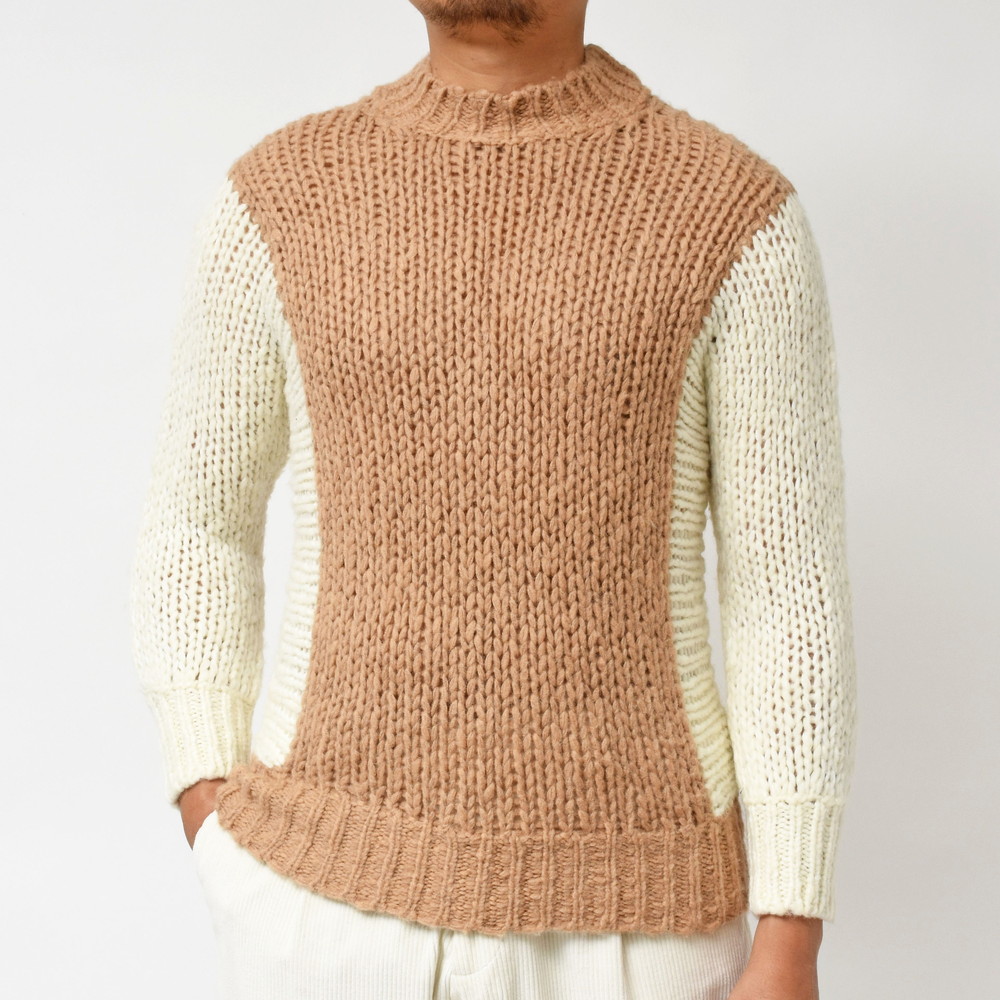 ザックリと編み上げつつ、脇の編み地に変化を付けるなどテクニカルな一面も持ち合わせ、その見え方が着た時の雰囲気に深みを与えているように思います。