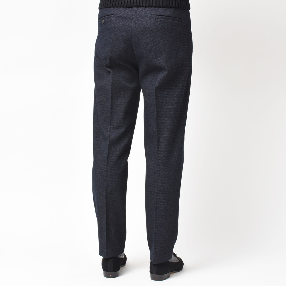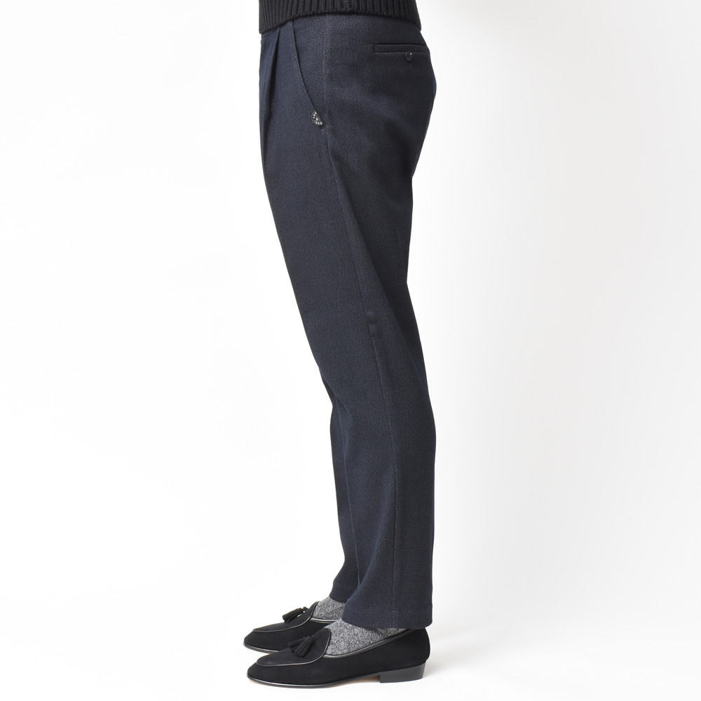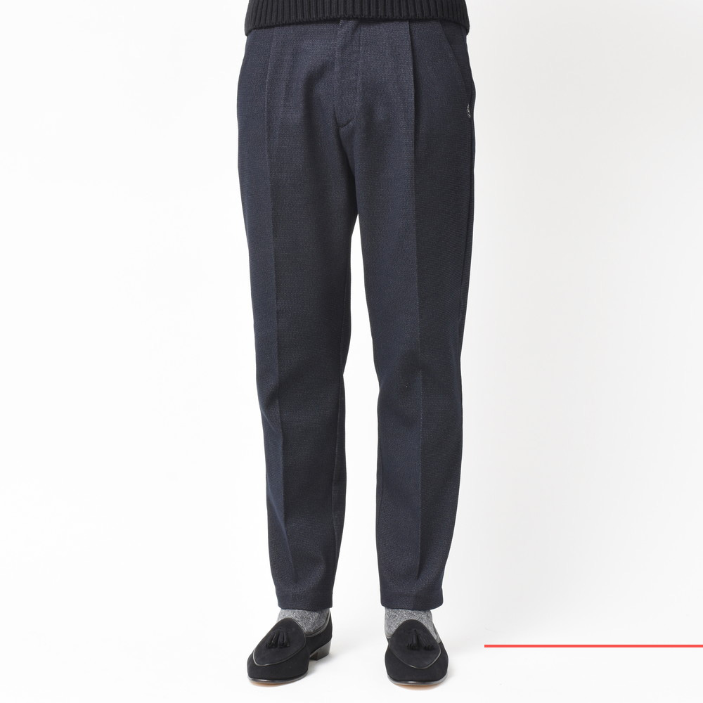 非常に現代的なアプローチが上手いT-JACKET、このシャーリングパンツもその一つでして1プリーツ仕様で腰回りにやや余裕を持たせて、裾に向かって緩やかにテーパードしていくライン取り、凄く今の気分を反映した仕上がりに。