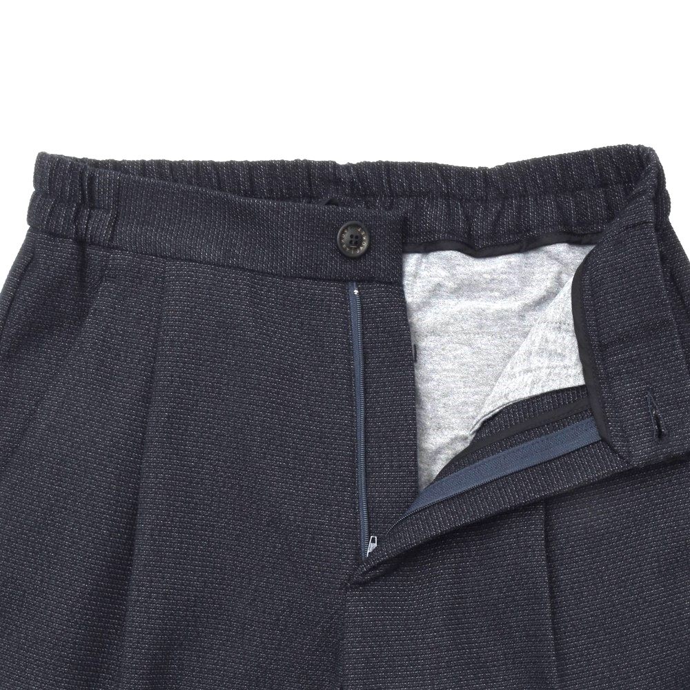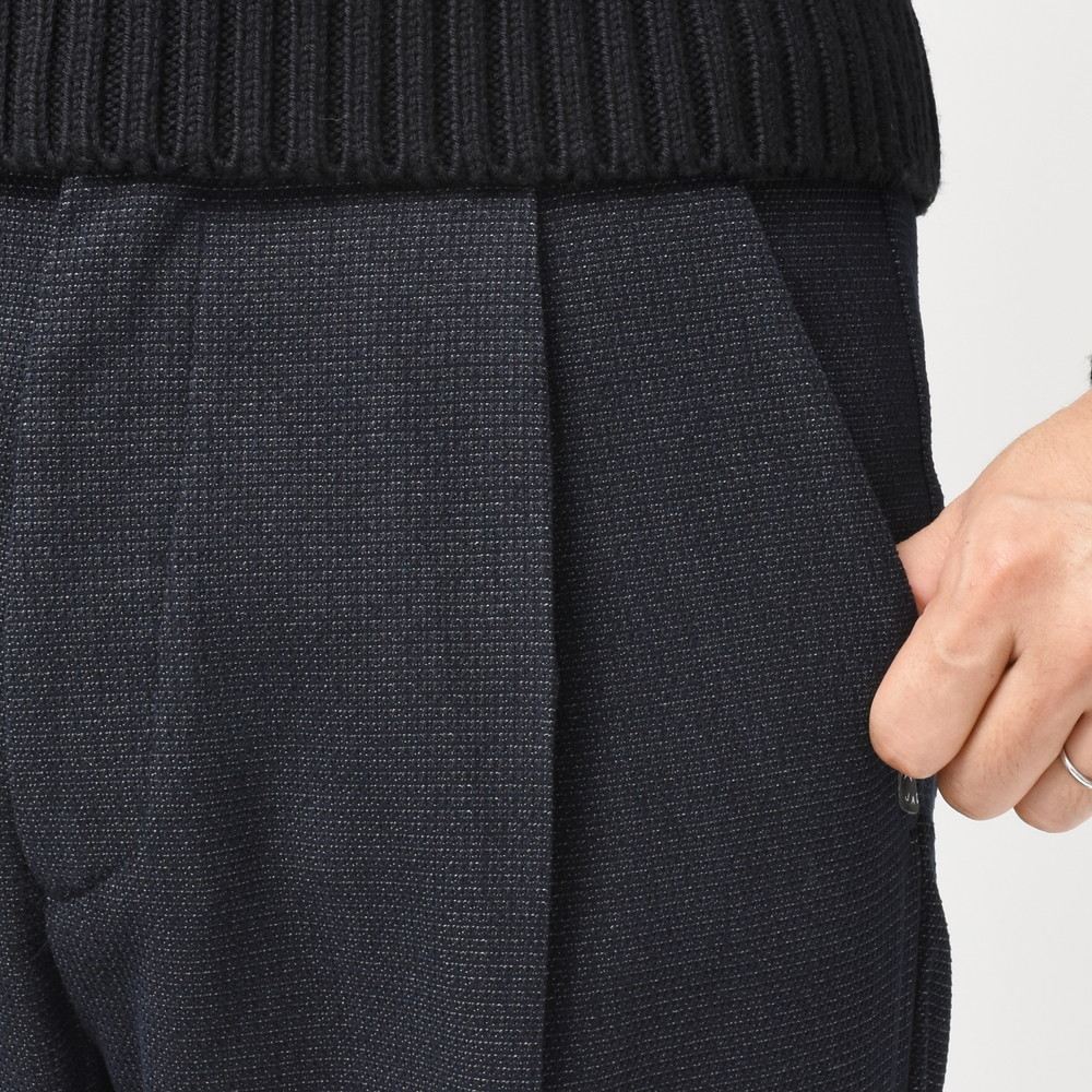 細かな織り、上品な艶感とジャージ特有の伸縮性を併せ持つT-JACKET(ティージャケット)のシャーリングパンツはクリーンに見えてスポーティーであり、カジュアルなようでいてドレス感のある仕上がりです。