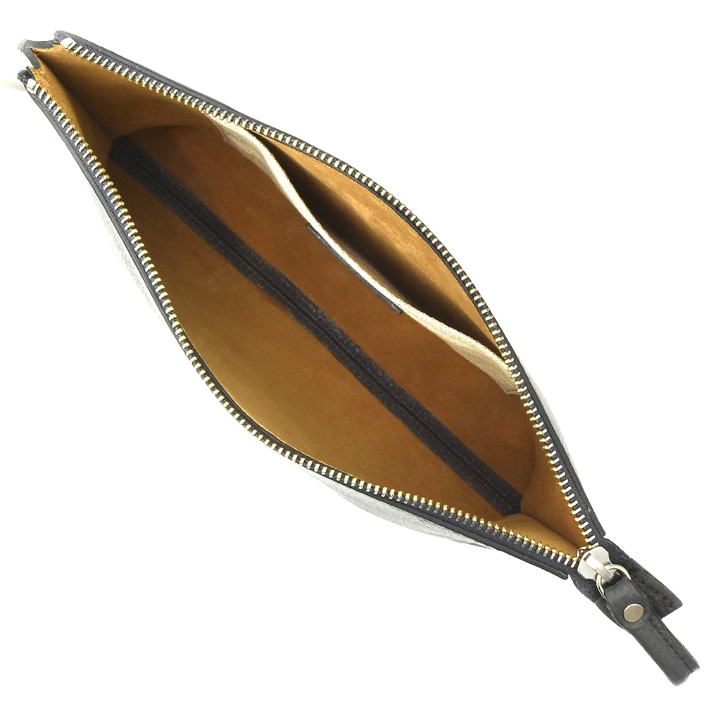 通常のクラッチバッグよりもやや小ぶりのタイプになっておりまして、非常に扱いやすくバックインバックにも最適なアイテムだと思います、こういったちょっと気の利いた仕様はDaniel&Bobならではですね。