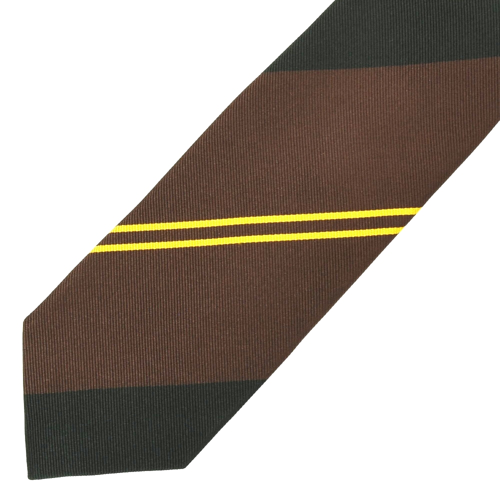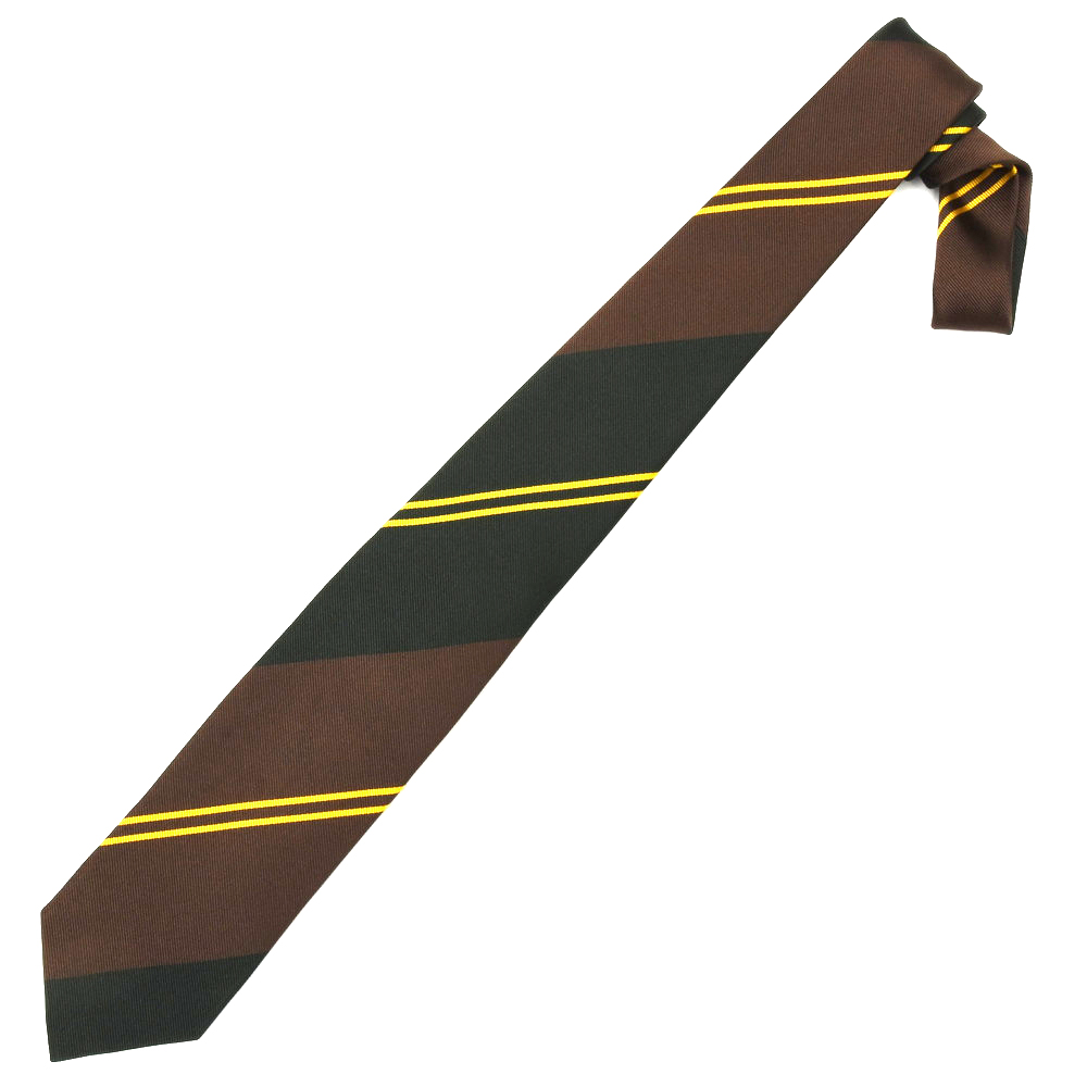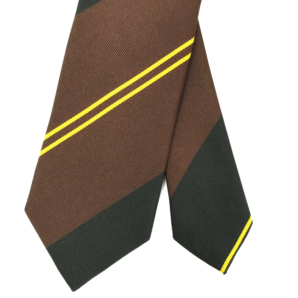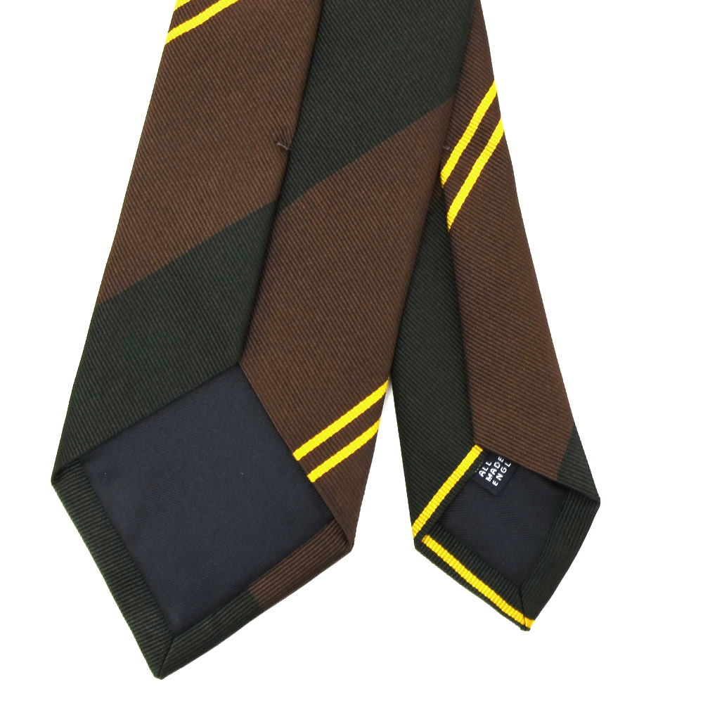 グリーンとブラウンという英国気分の高まる配色のレジメンタルにフレッシュさをもたらしているイエローのダブルストライプ。