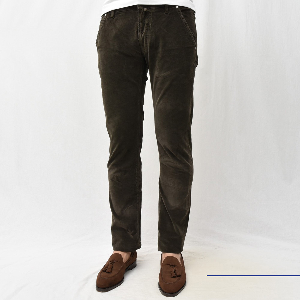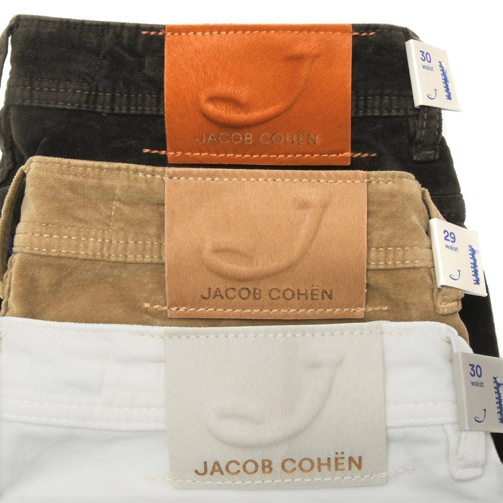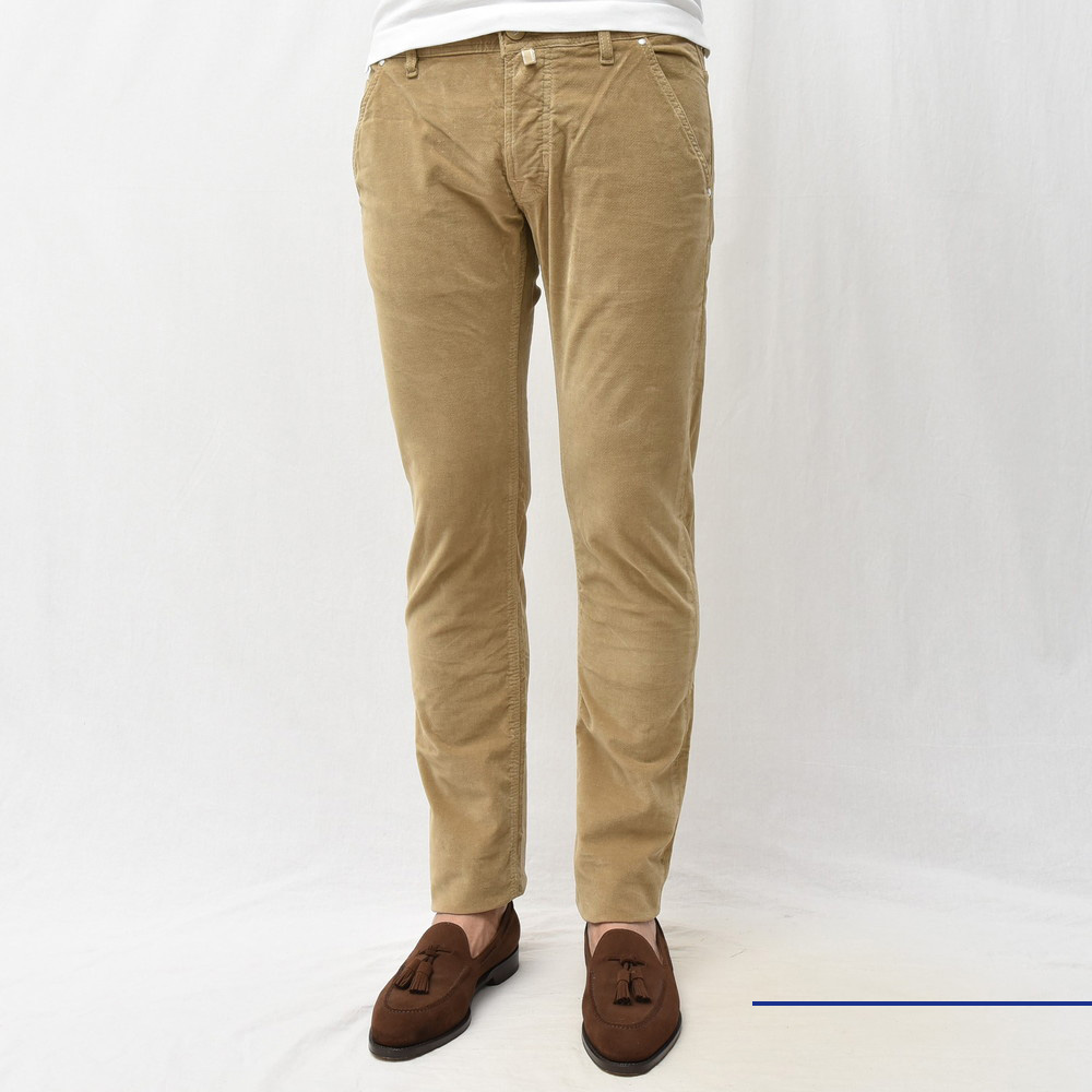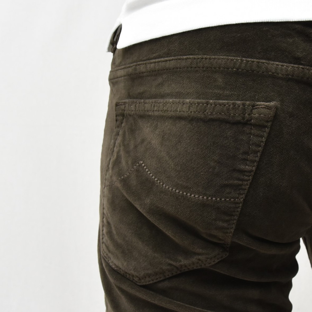 キメの細かくないベルベットの様な、敢えてカジュアル色を強くした起毛素材を用いることで独特な表情を生み出しているJACOB COHENならではの一本ではないでしょうか。