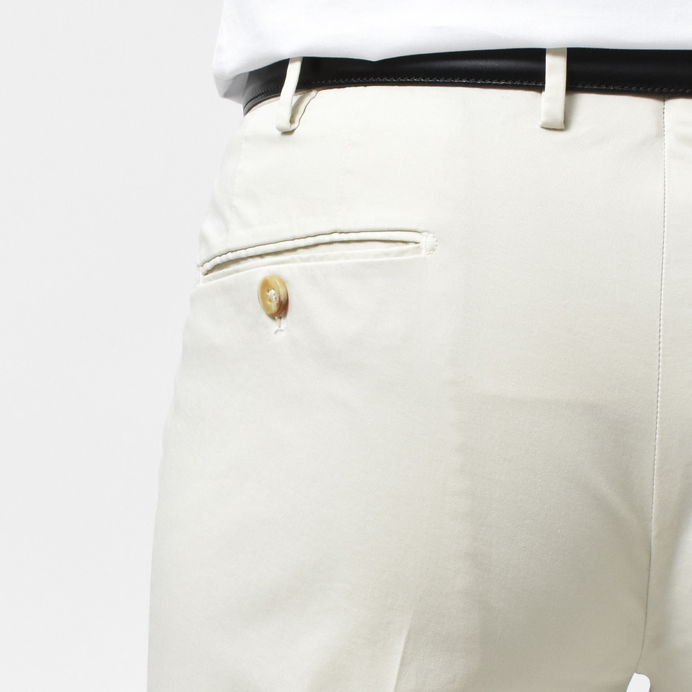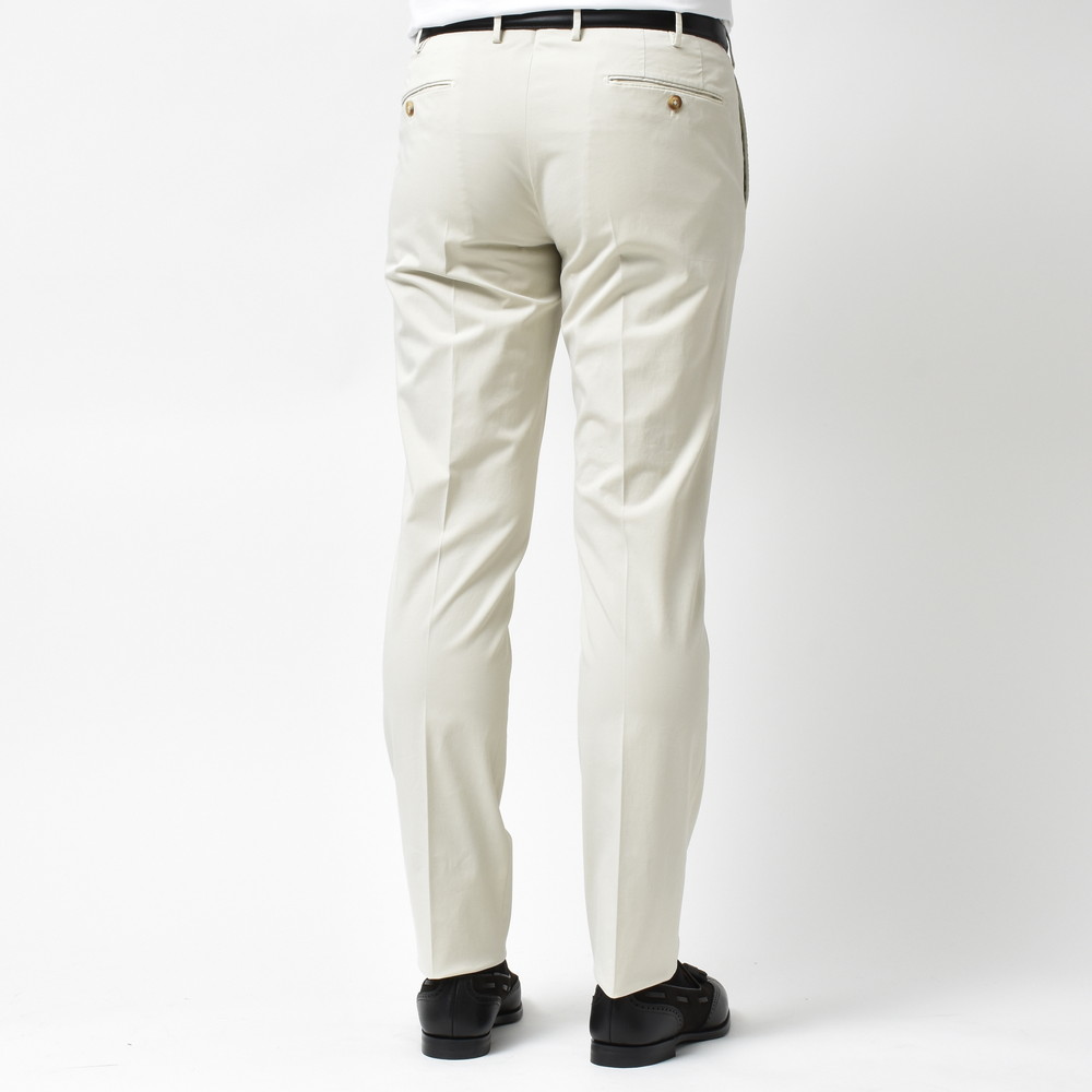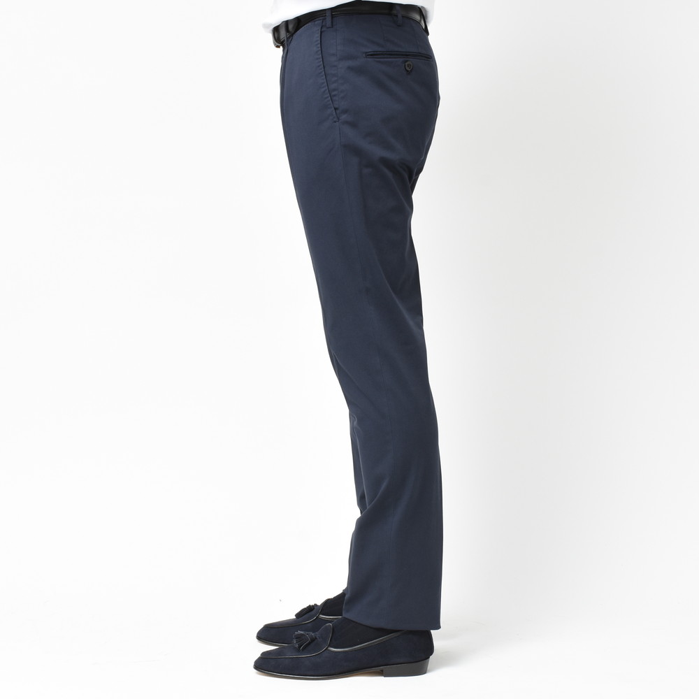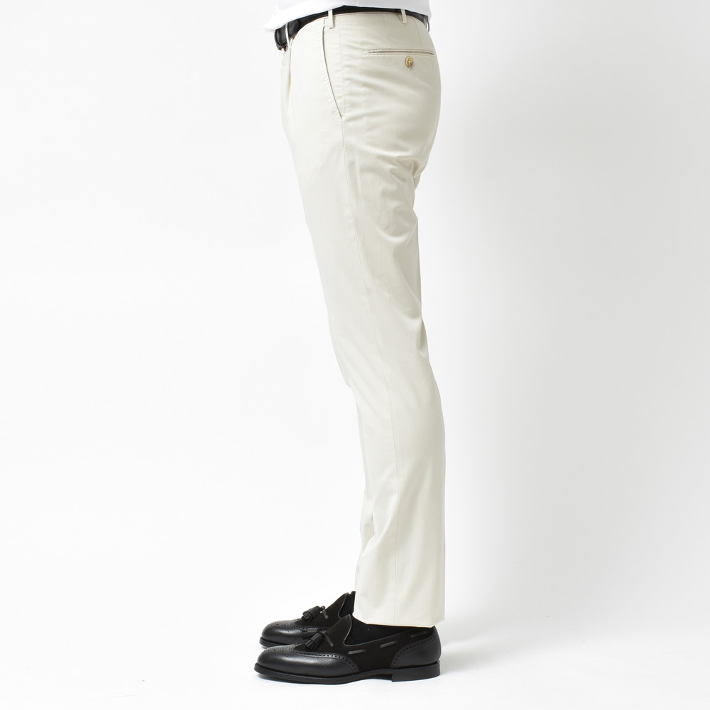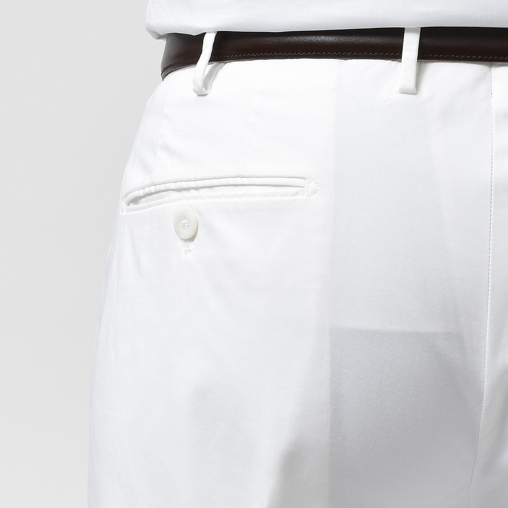 上品でクリーンなタッチ、ストレッチ生地特有の伸縮性によるコンフォート性、コットンならではの軽やかさと爽やかさ。ビジネスシーンはもちろん、カジュアルスタイルを上品にまとめたい時にかなり活用できるタイプのパンツです。