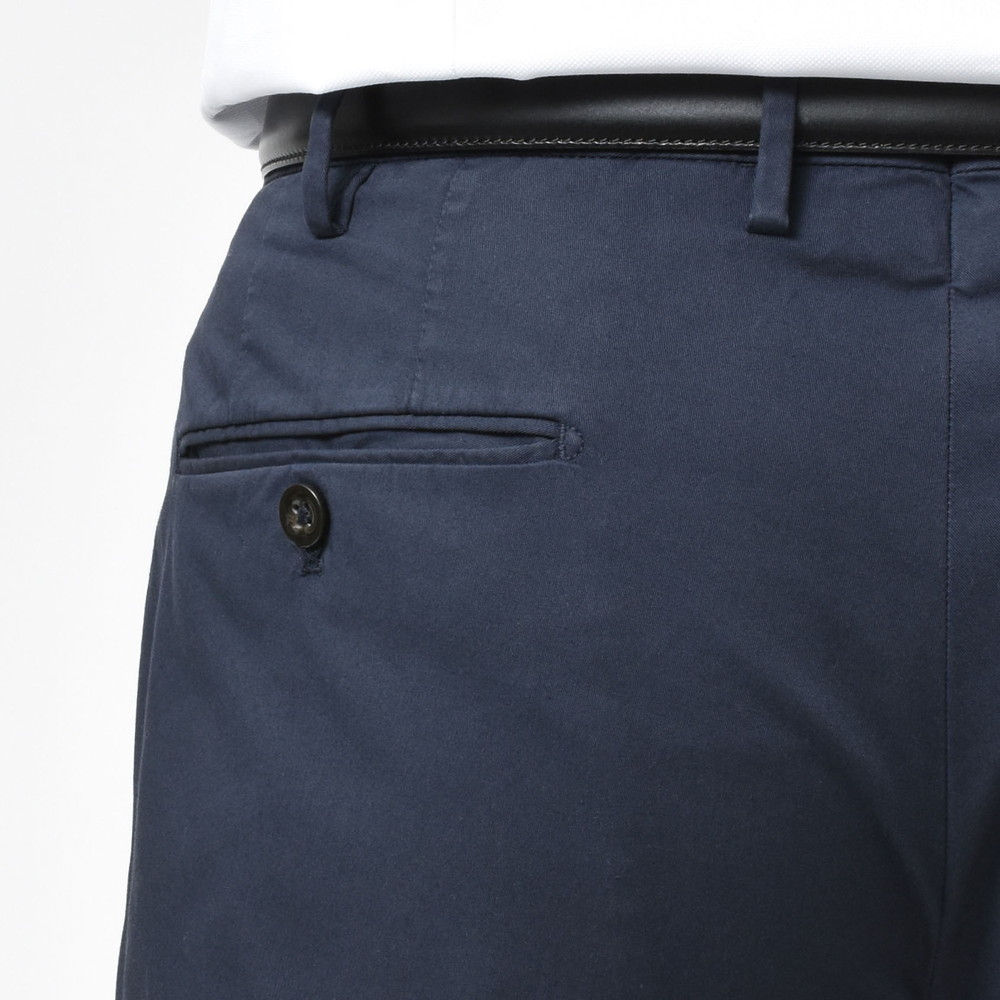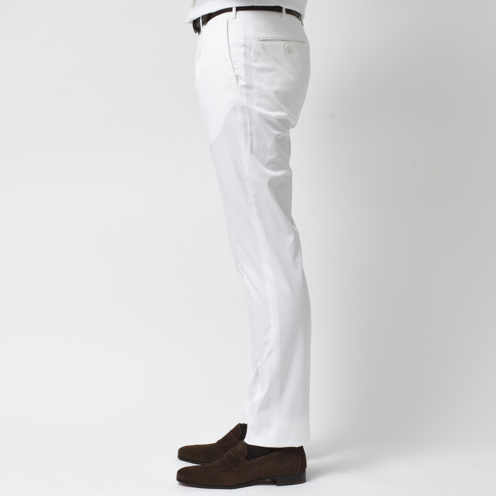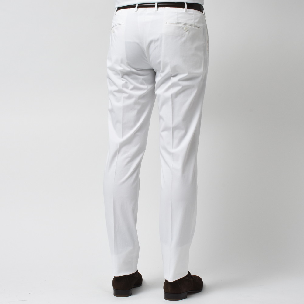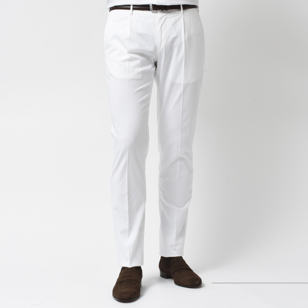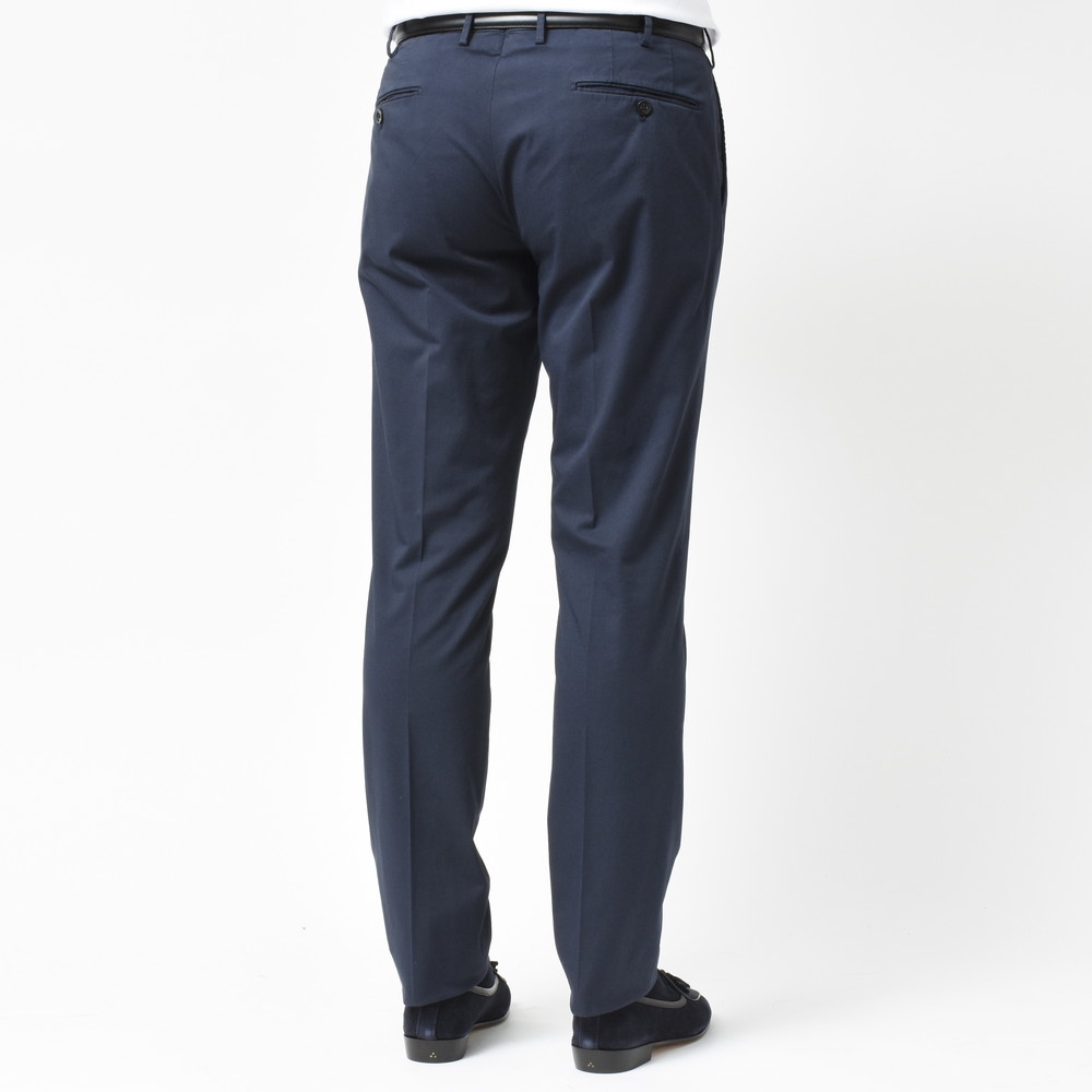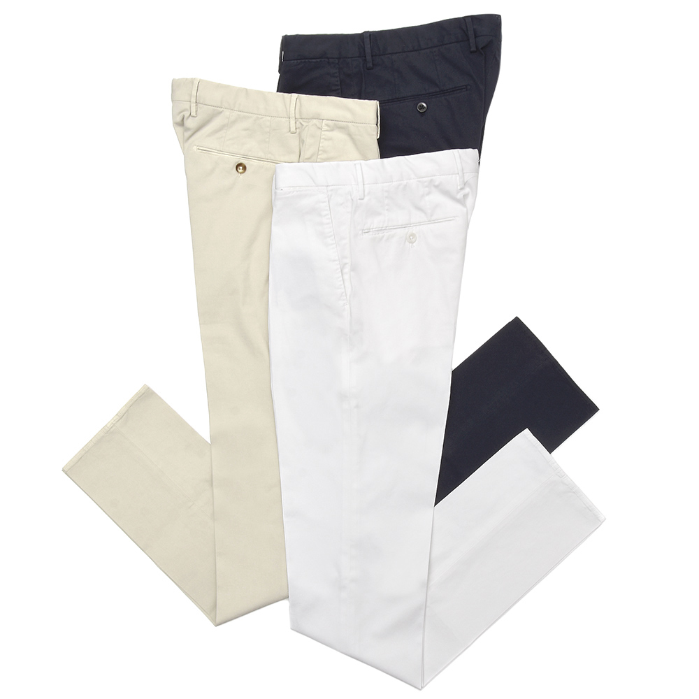 上品でクリーンなタッチ、ストレッチ生地特有の伸縮性によるコンフォート性、コットンならではの軽やかさと爽やかさ。ビジネスシーンはもちろん、カジュアルスタイルを上品にまとめたい時にかなり活用できるタイプのパンツです。
