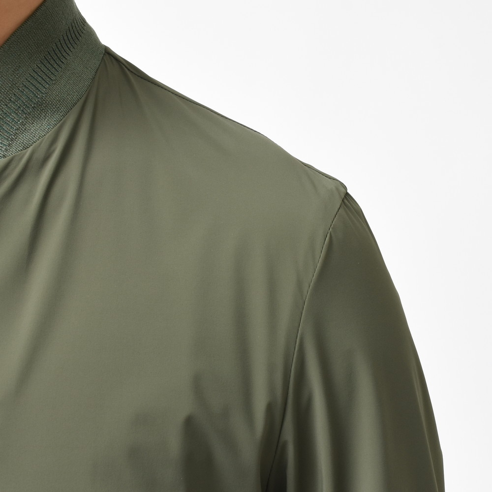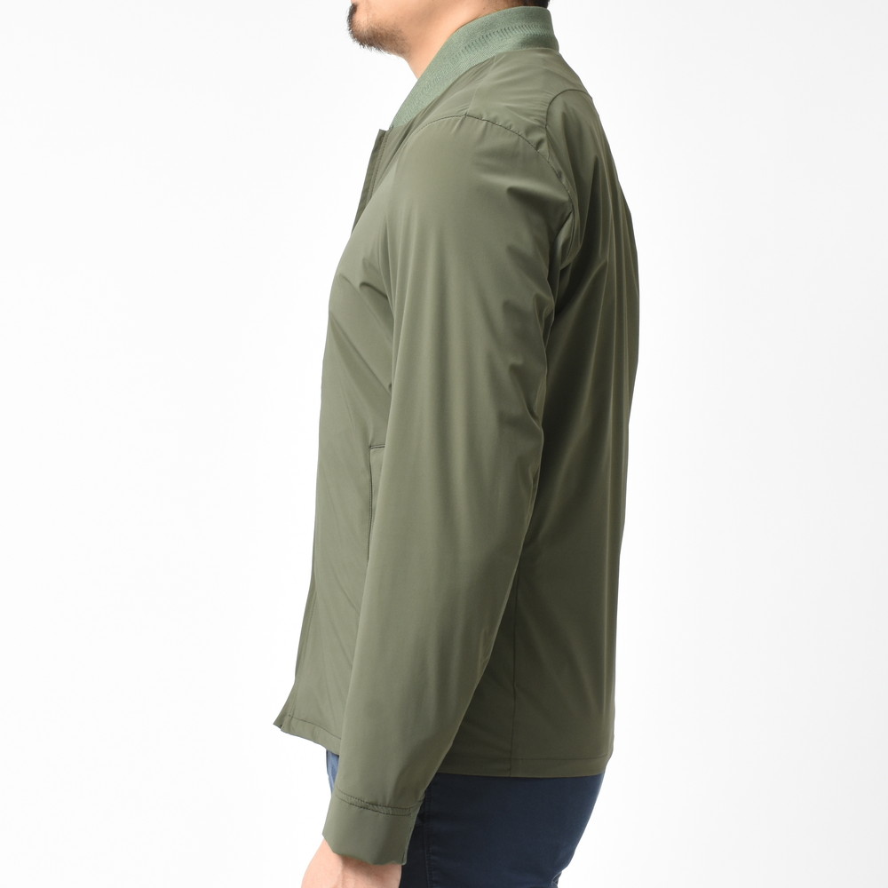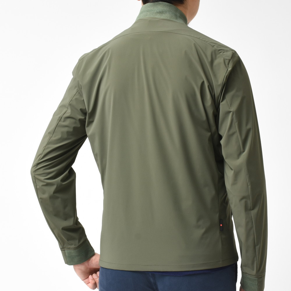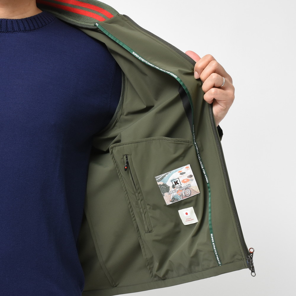 KIRED(キーレッド)が独自に開発した超軽量&超伸縮のスーパーストレッチナイロンを使用したシンプルなボマー型ブルゾン、一般的なデザインでは裾にリブが付きますが敢えて排し、ネックと袖先後ろ部分のみにとどめることでシャープさを意識した仕上がりにフィニッシュです。