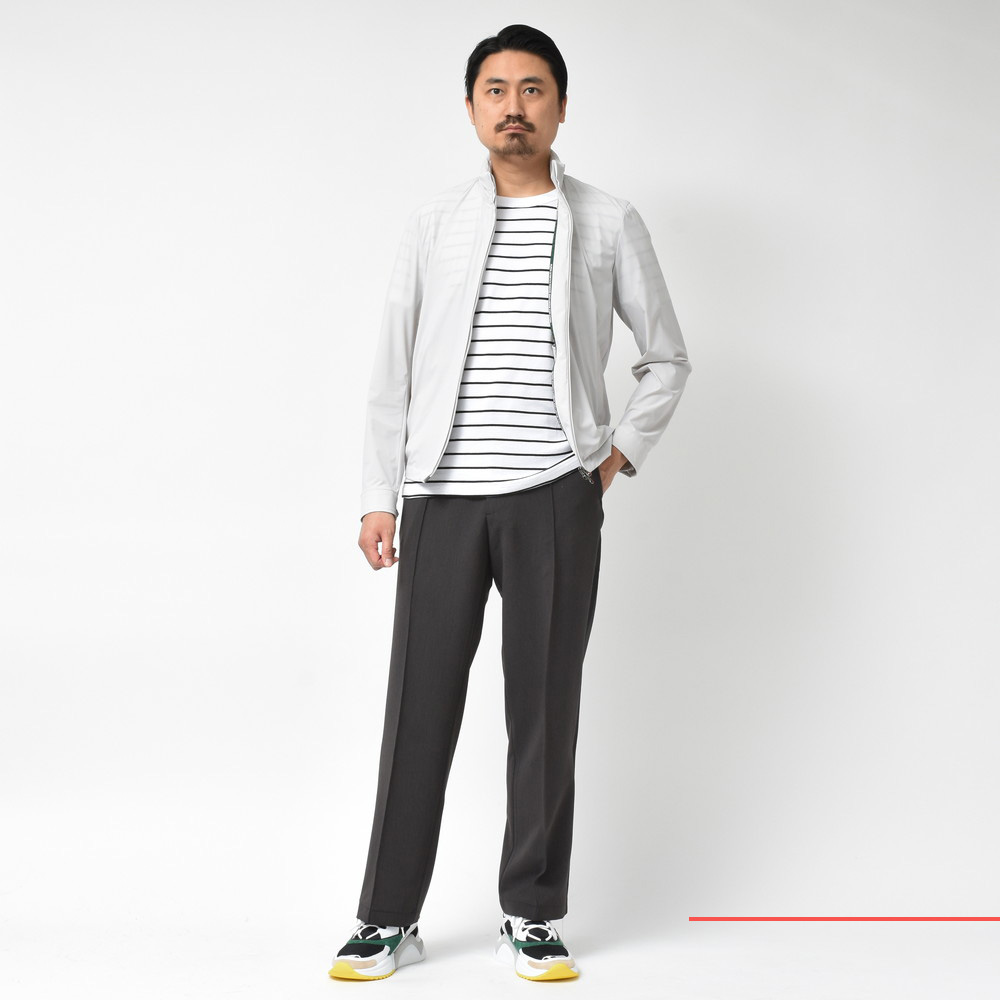 着心地の良さとルックスの両立が素晴らしいレベルで両立されていて、一見普通のナイロン素材に見えるんですが、とにかく軽くてストレッチ性が高いというのが特徴です。