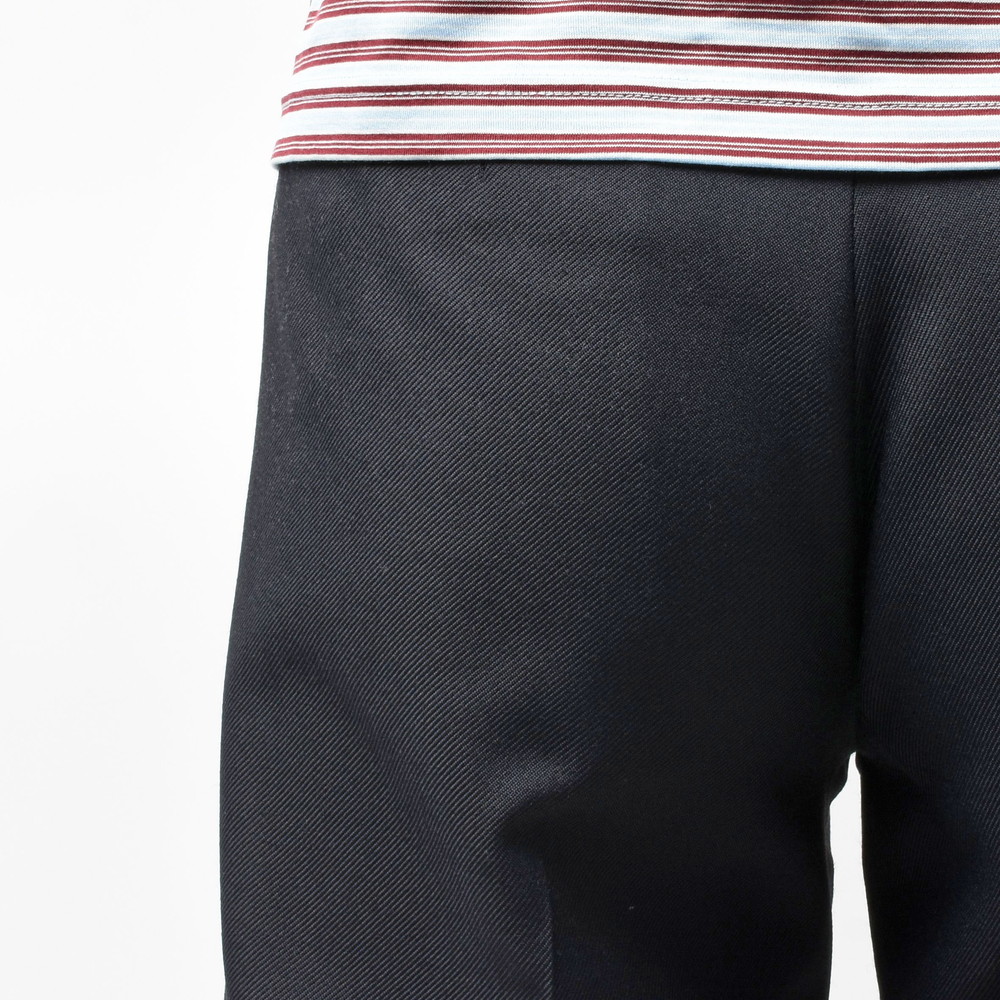 鈍い光沢を放つ生地感対して渡り幅広めでテーパードを効かせ過ぎないストレートよりのシルエットは、生地の重さも相まって裾までストンと綺麗に落ちてくれる秀逸なシルエットに。