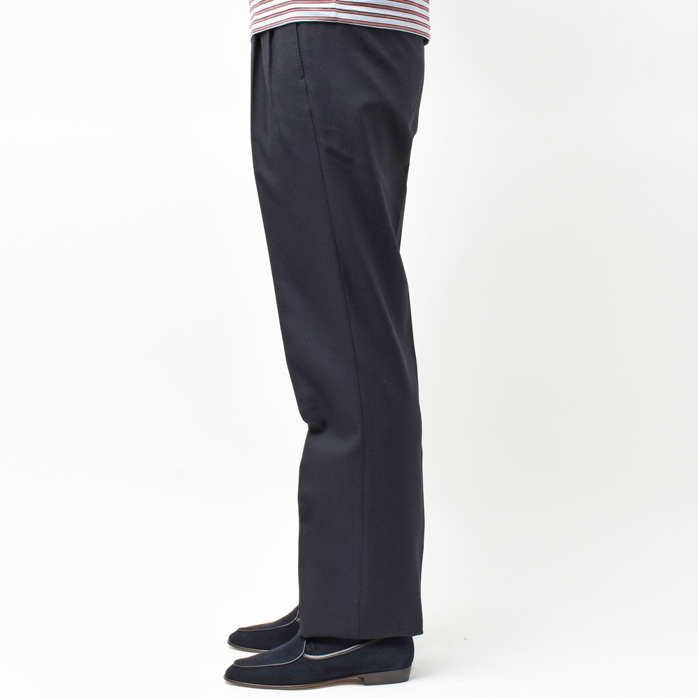 裾幅18cm前後が主流のイタリア物と比べると明らかにストレートなので、モダンさや洗練といったイメージとは少し遠い気がしますが、なかなかどうして穿くとスマートでシャープなんですよね。