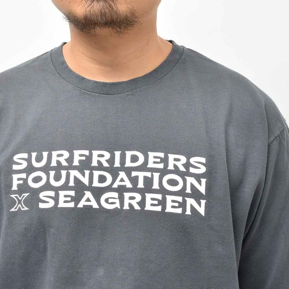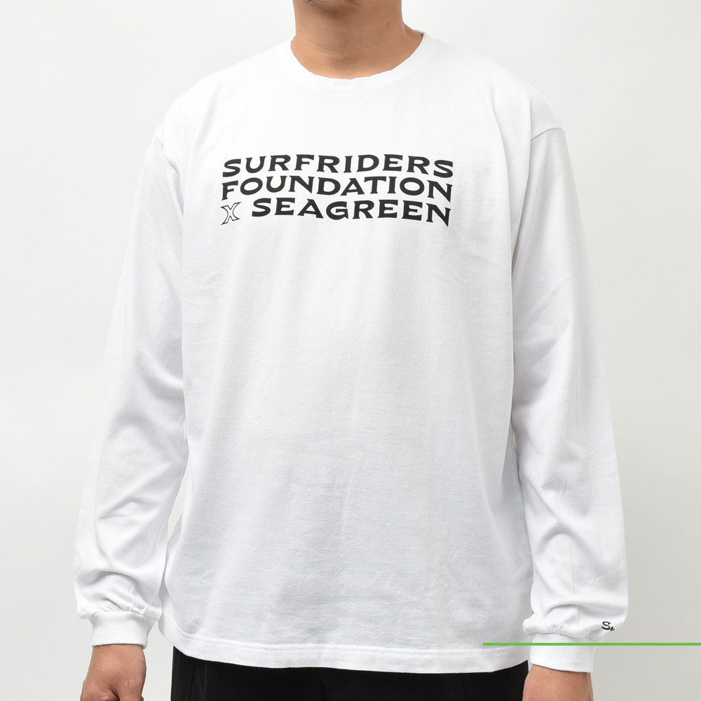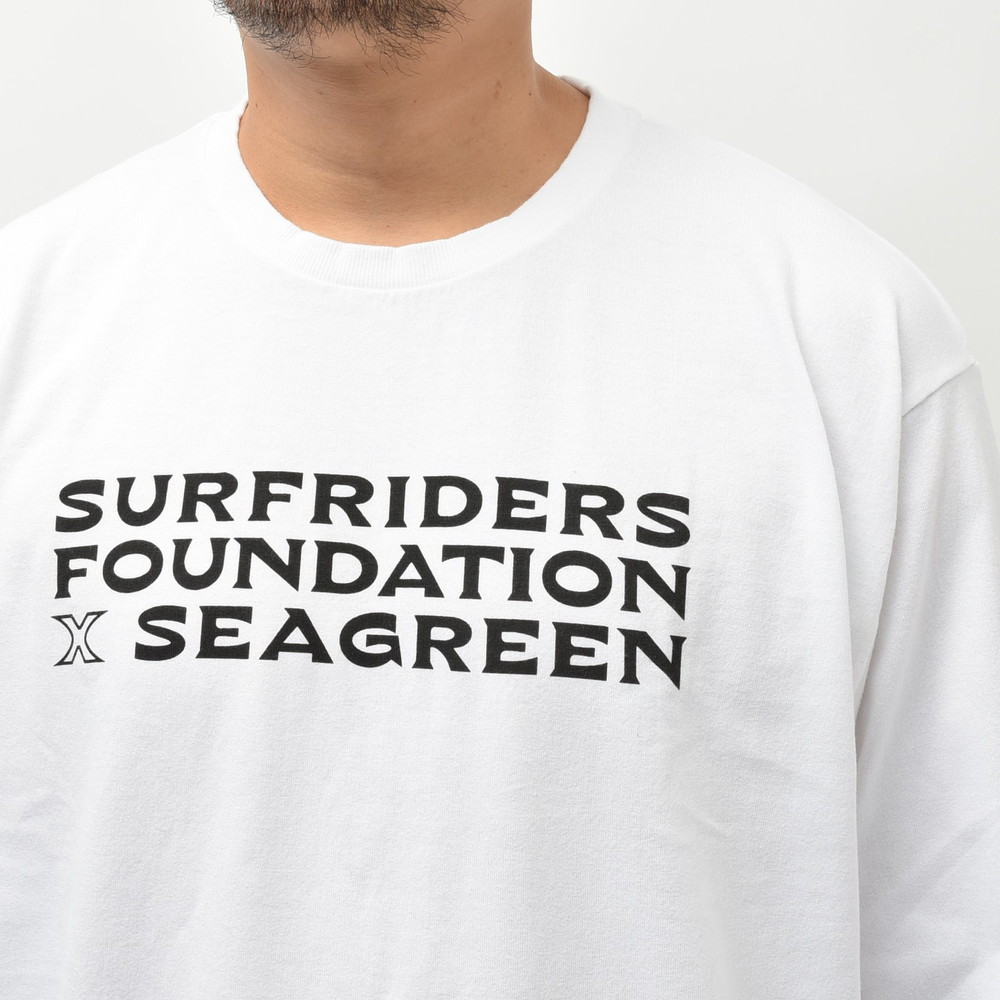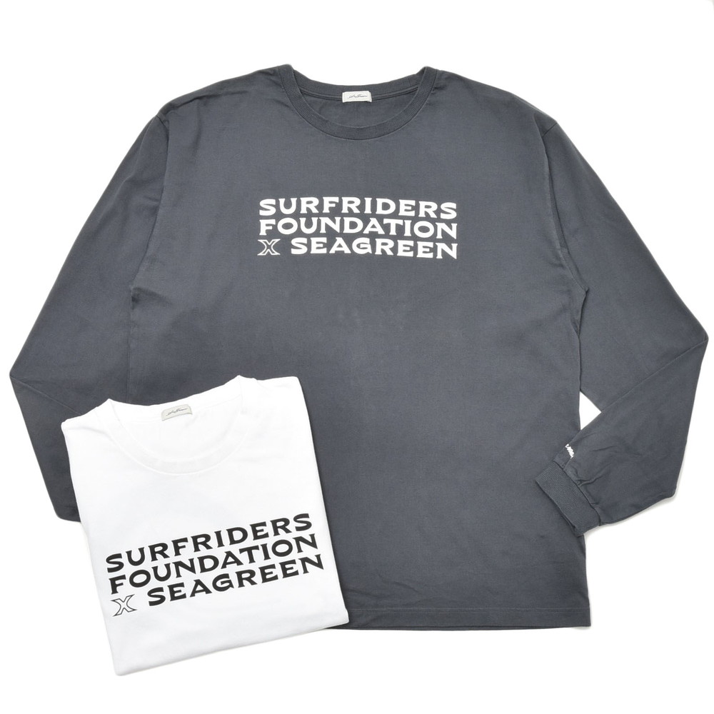 海岸環境の保護を目的とした『SURFRIDER FOUNDATION』とのコラボレーションアイテムであるSeaGreen(シーグリーン)のクルーネックカットソー、前身頃には両者のネーム、後身頃には波をイメージしたマークをプリントした一着。