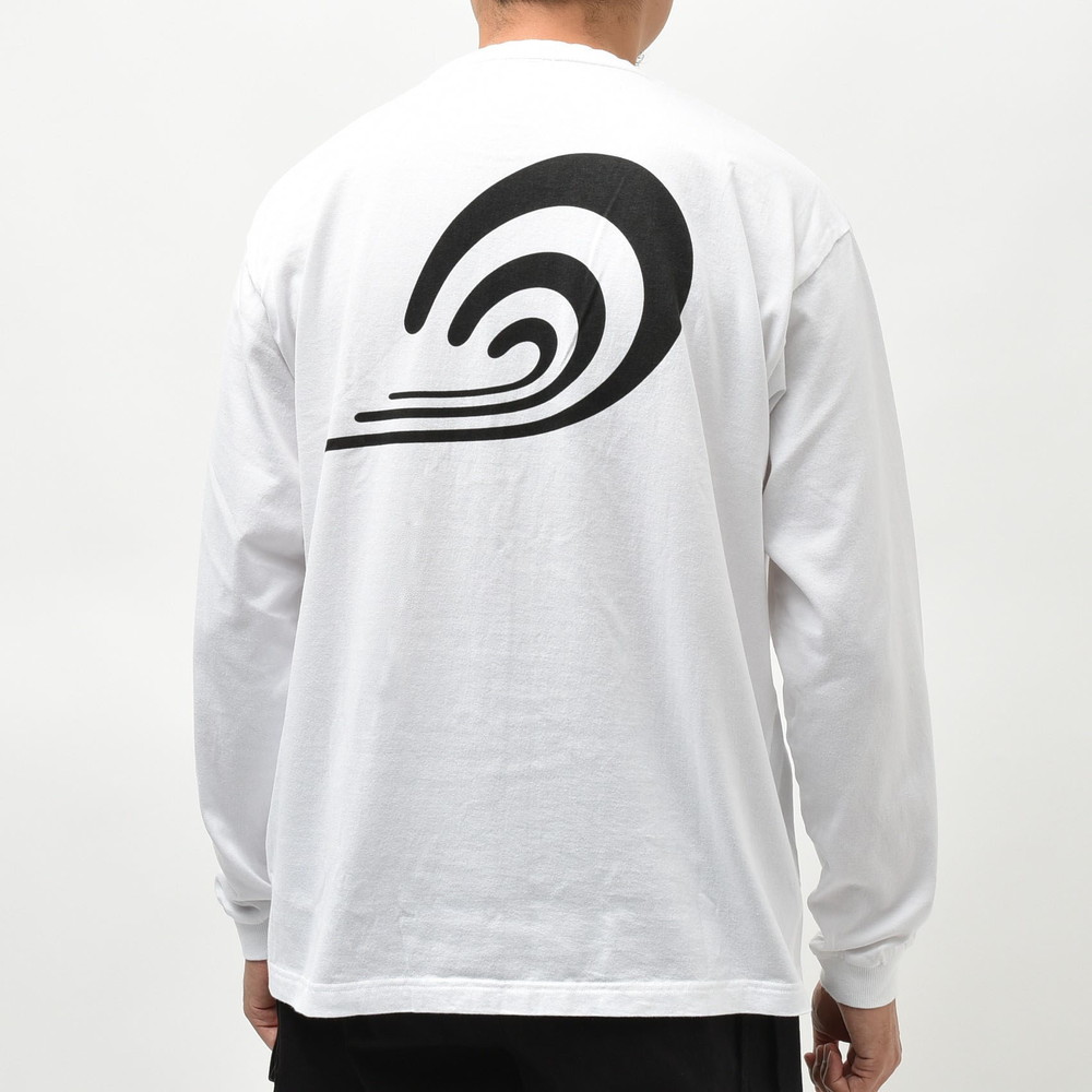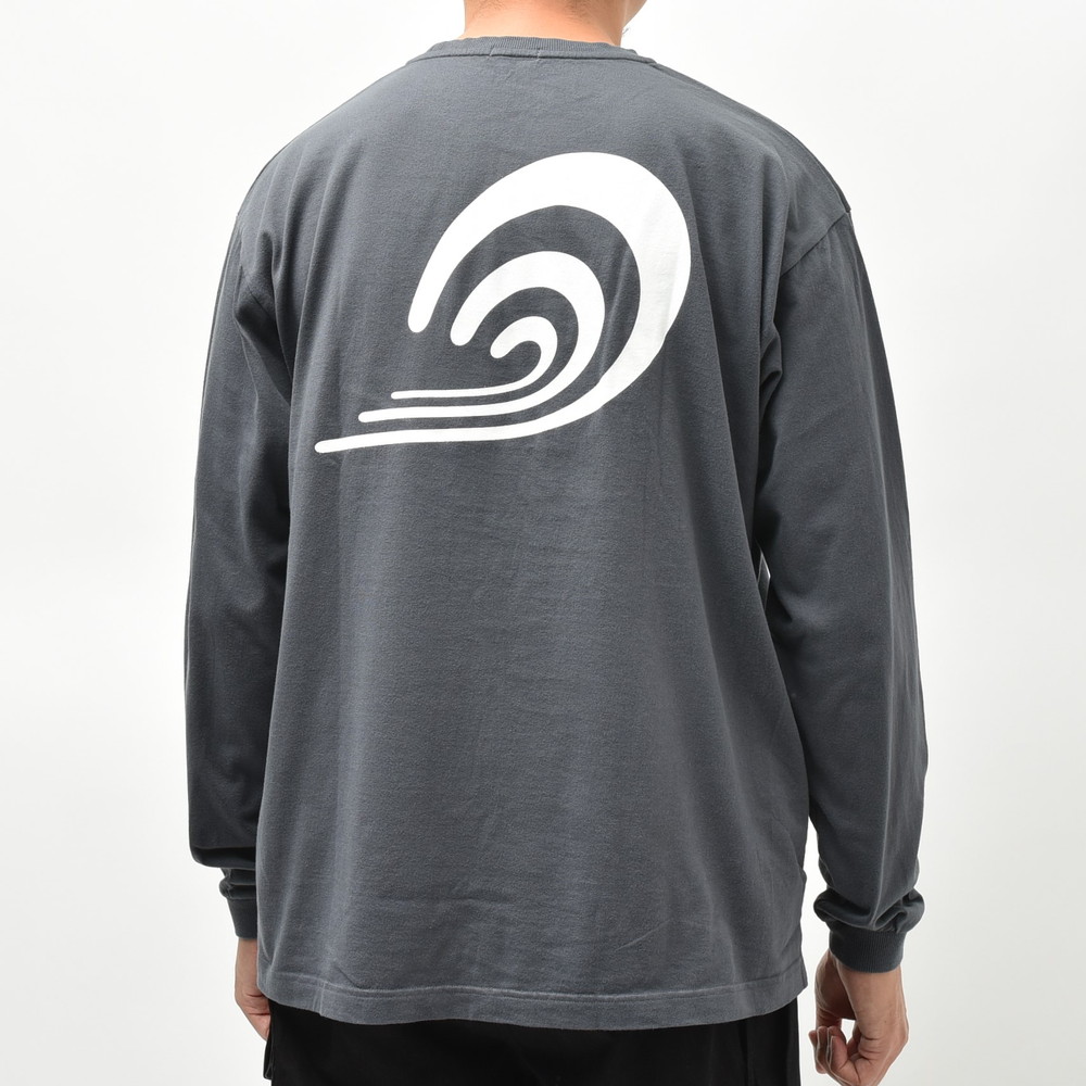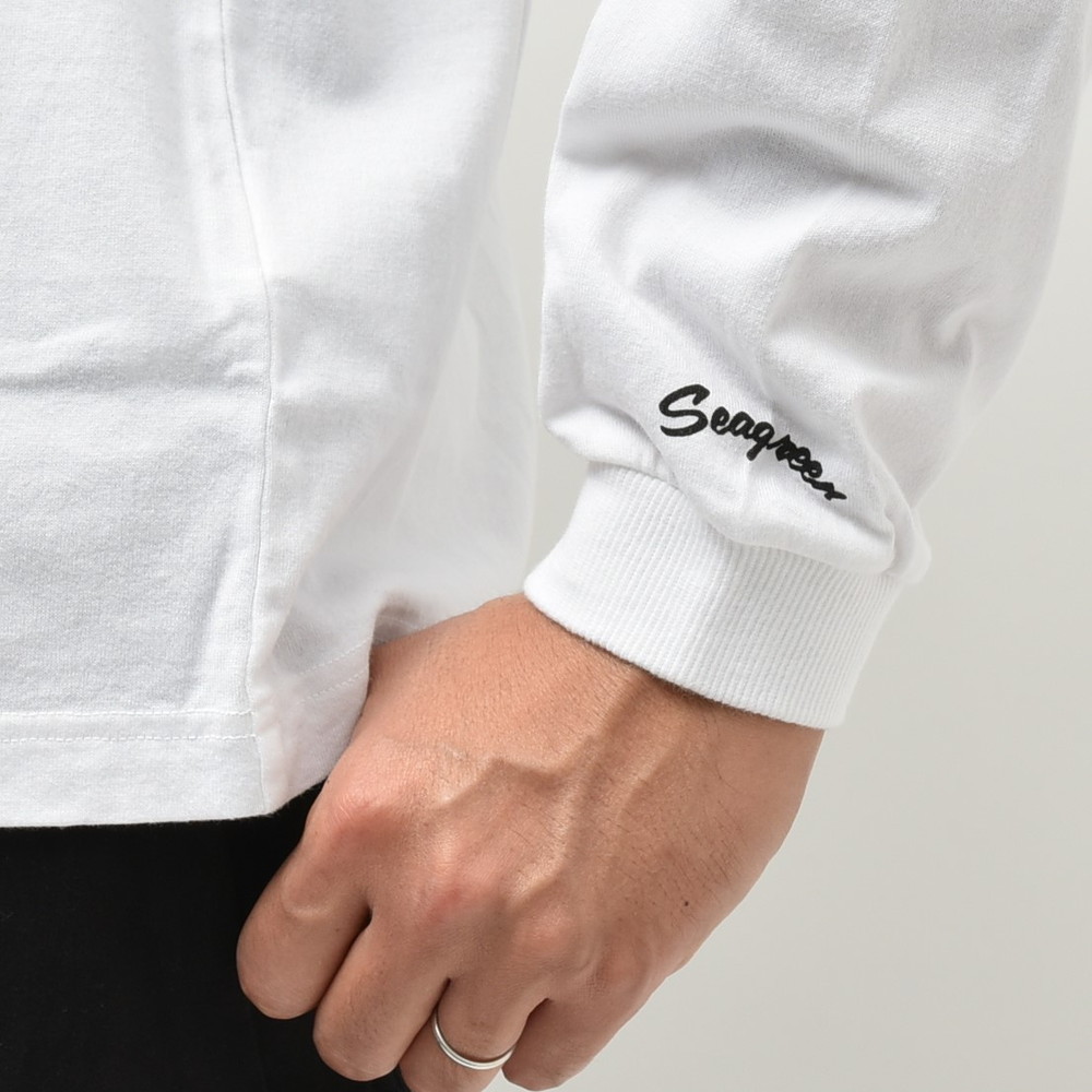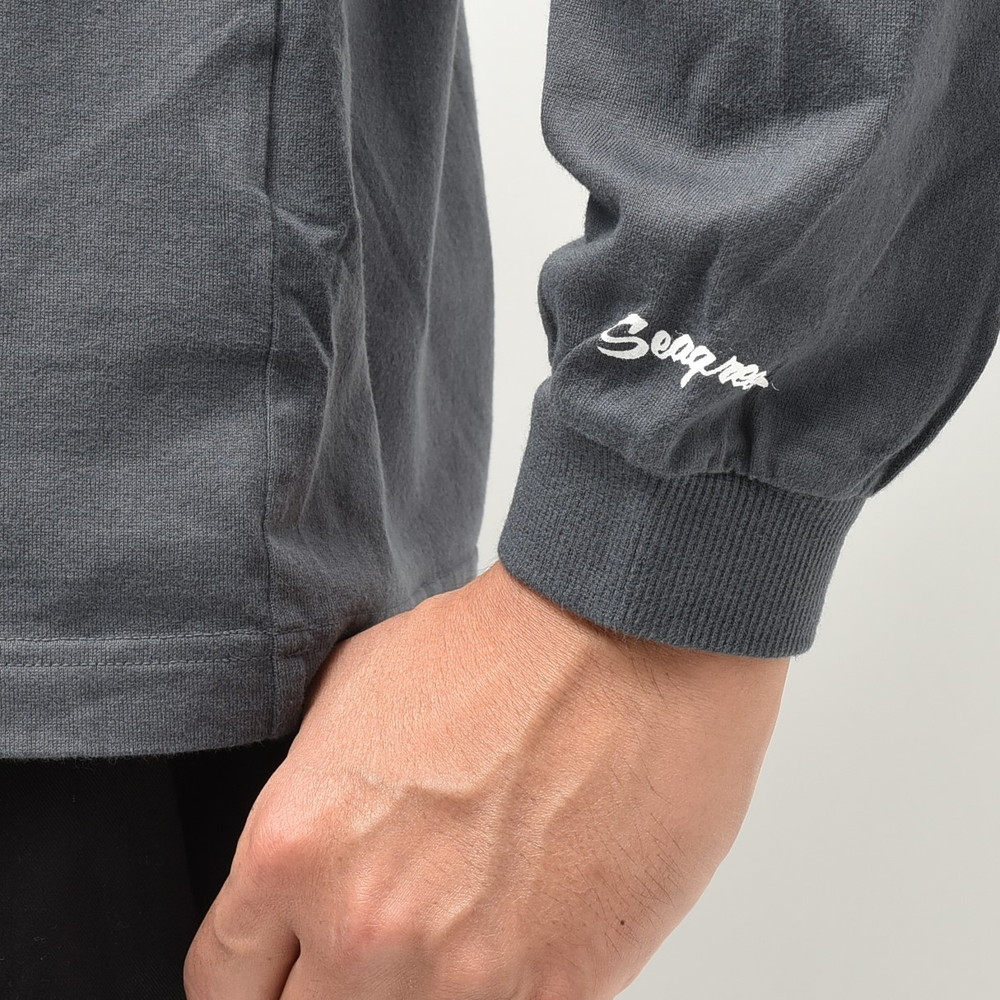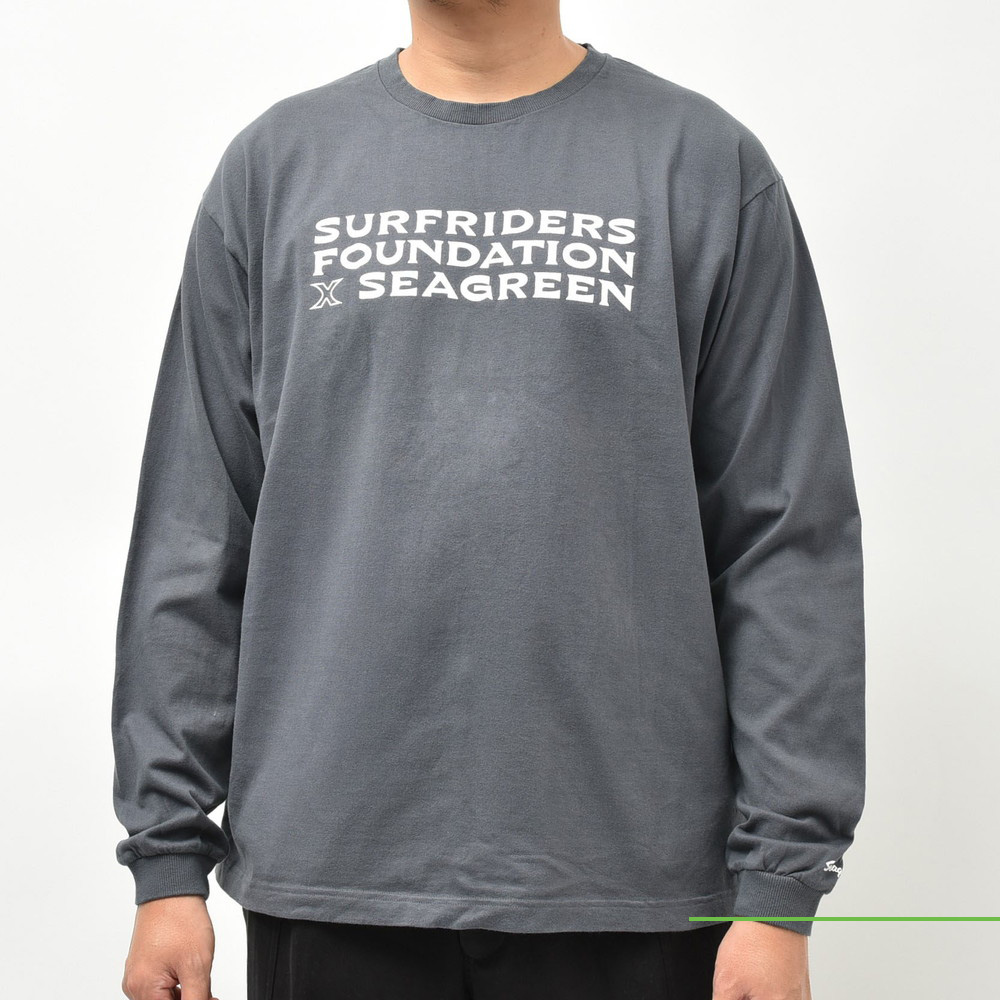 海岸環境の保護を目的とした『SURFRIDER FOUNDATION』とのコラボレーションアイテムであるSeaGreen(シーグリーン)のクルーネックカットソー、前身頃には両者のネーム、後身頃には波をイメージしたマークをプリントした一着。