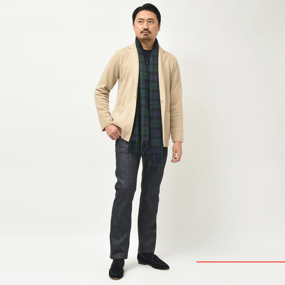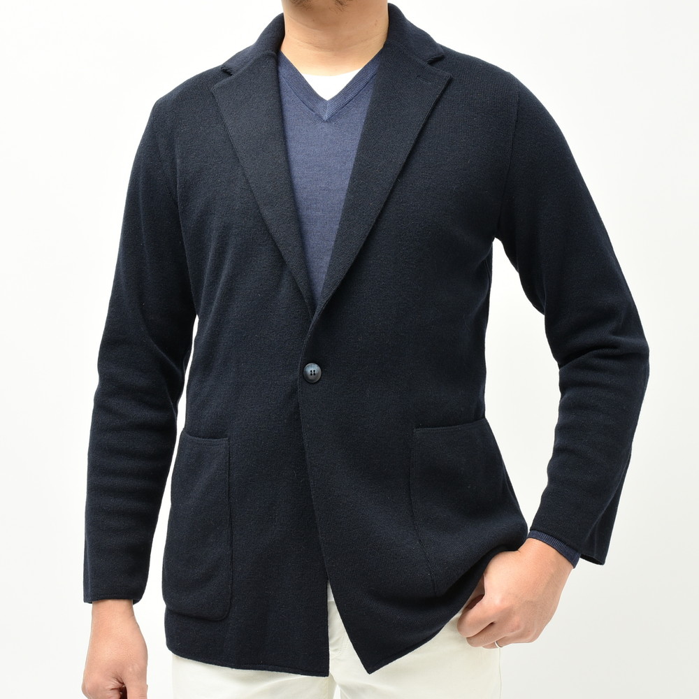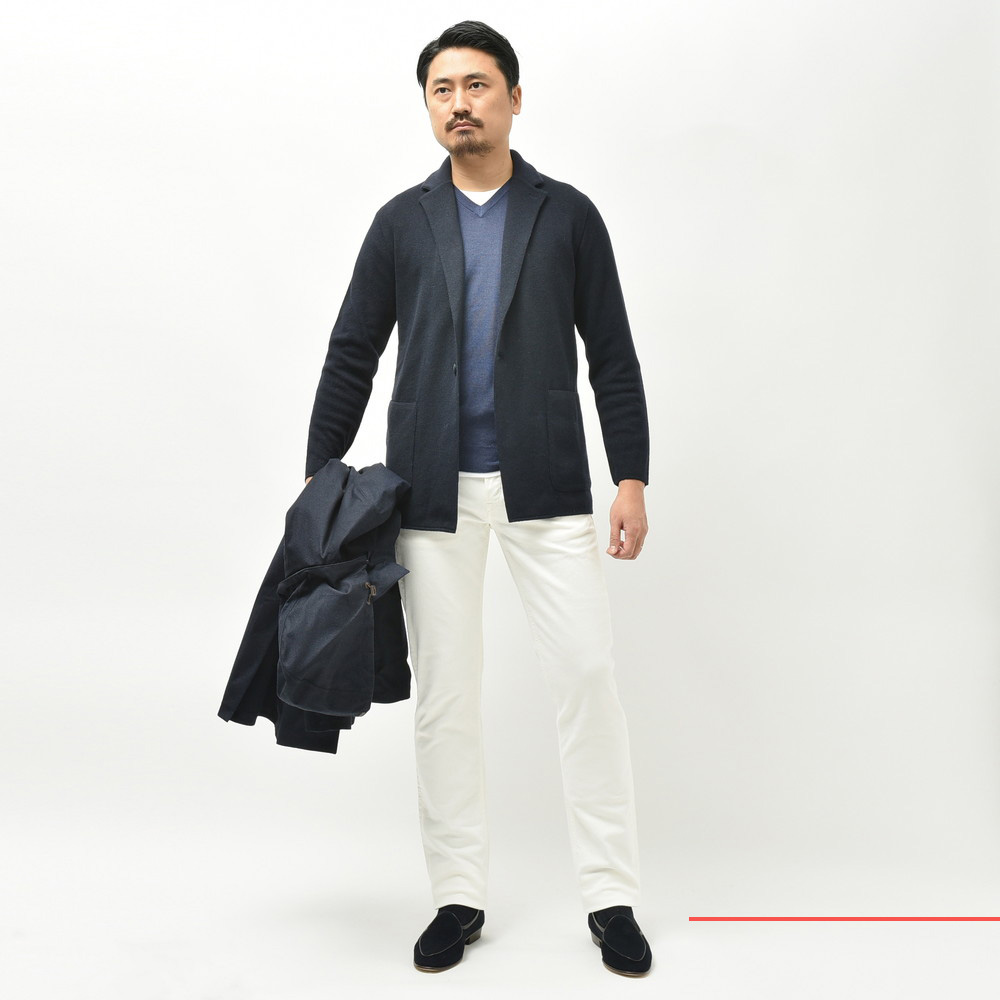 エレガントでカジュアルと言うと一見矛盾している様に聞こえますが、ジャケットの持つ大人っぽさや色気に、ニットの持つ柔らかくてカジュアルな雰囲気が上手くプラスされた秀逸な仕上がりなんですよね。