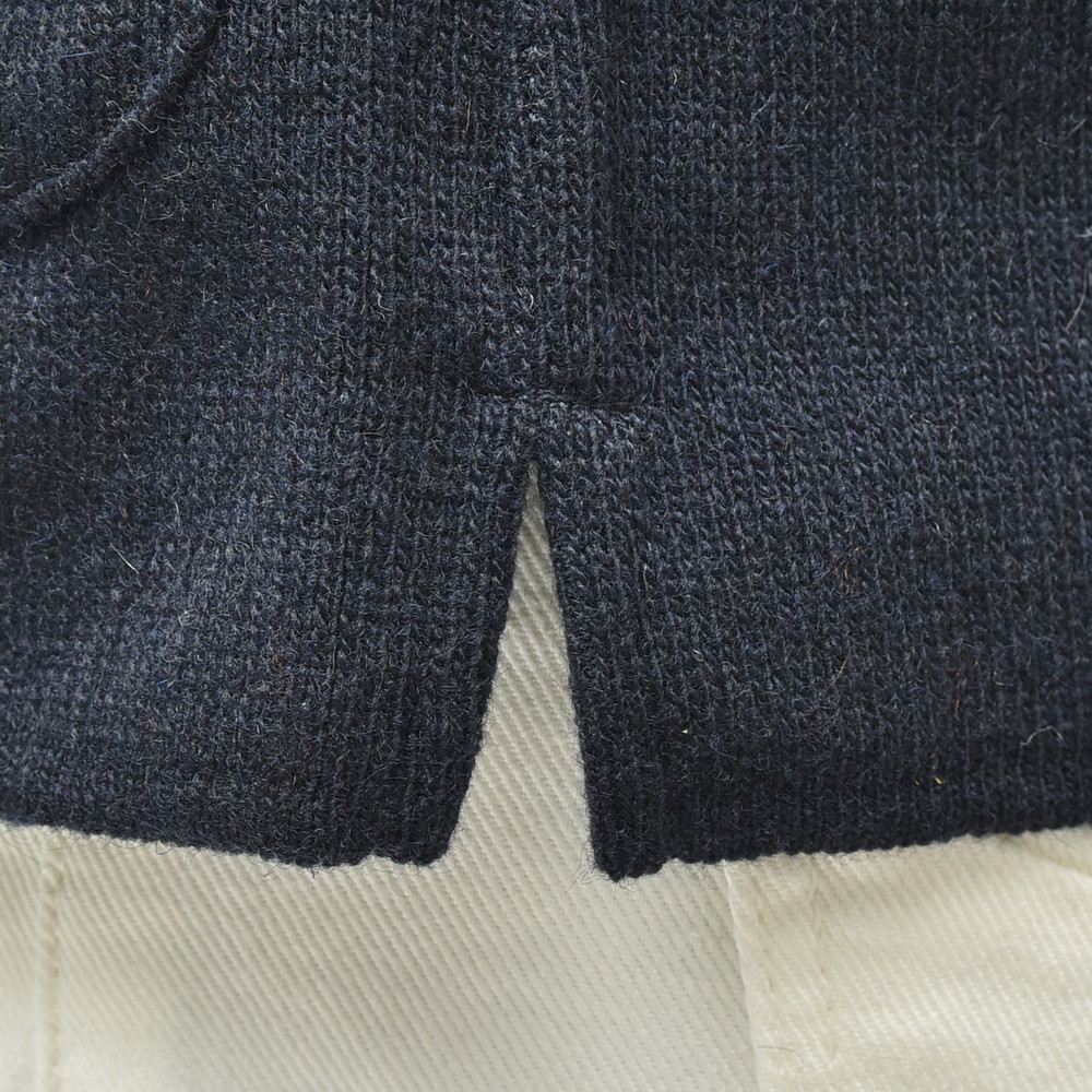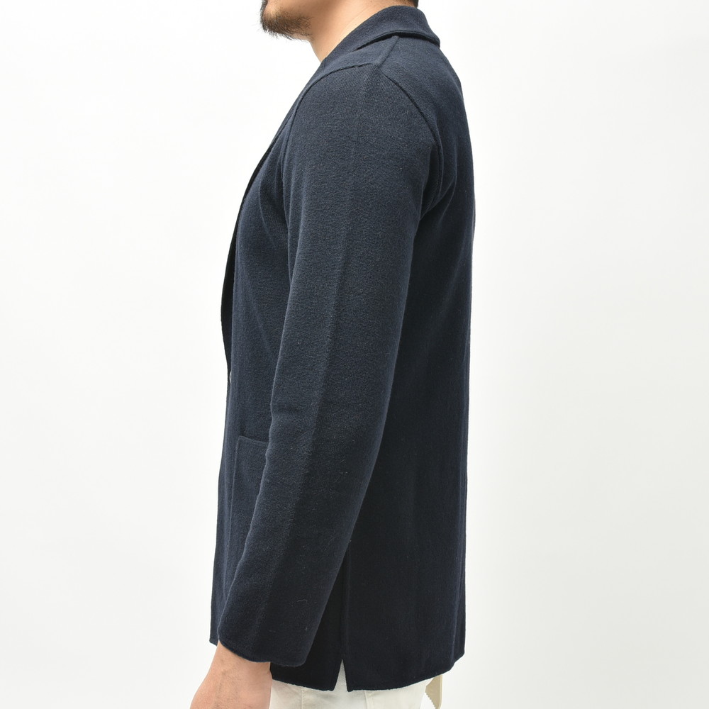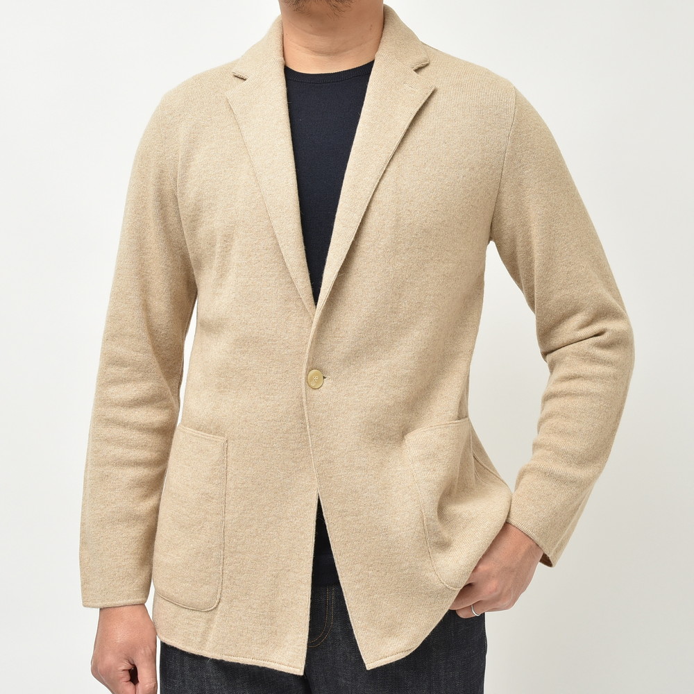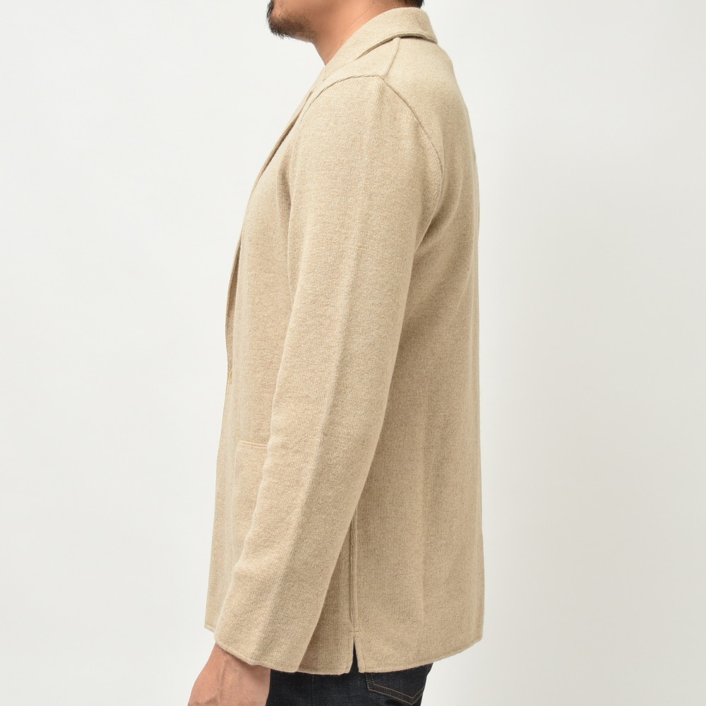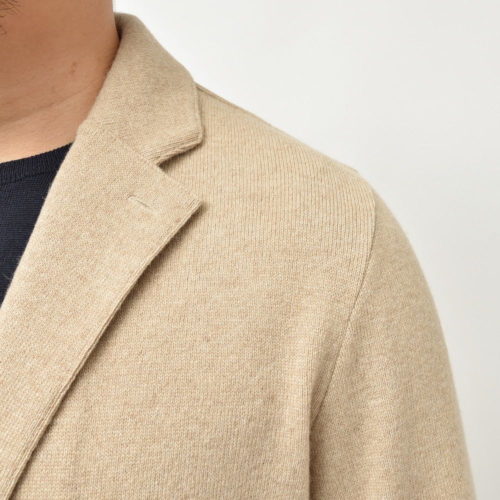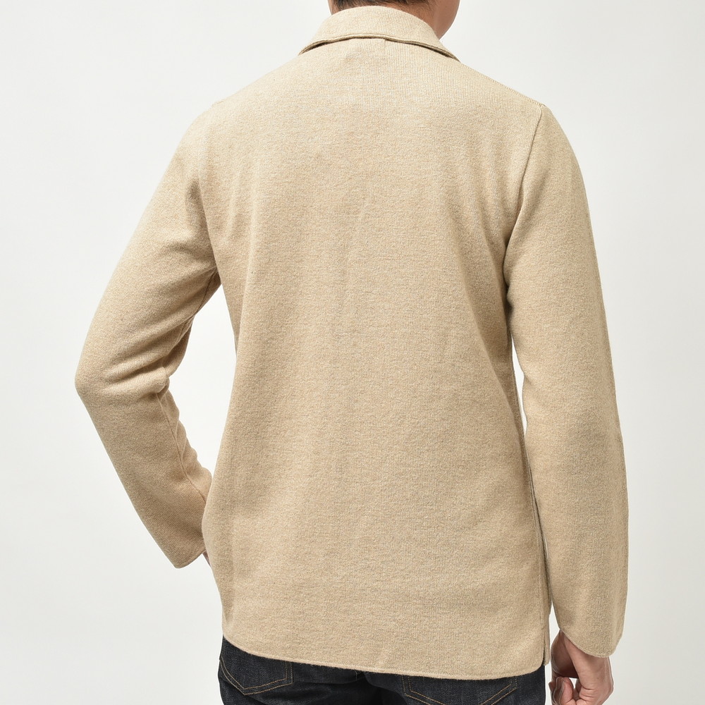 キチッとしたラペルがセットされてニットジャケットでは極めて珍しいタイプでして、ウエストのシェイプがほぼ無く、ベントの代わりにサイドスリットを採用する事でワークテイストを表現。かと思えば素材にはアルパカをベースにしたムードのあるニットを使用。