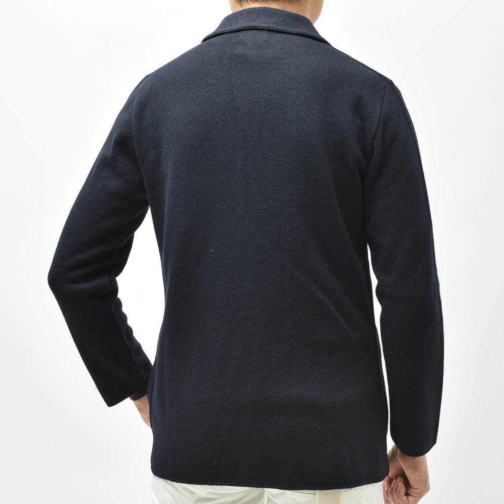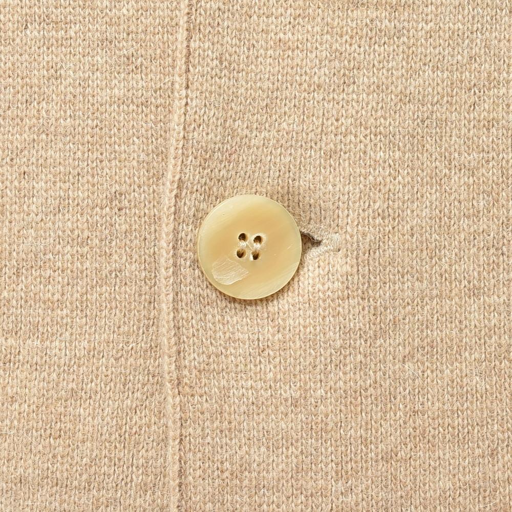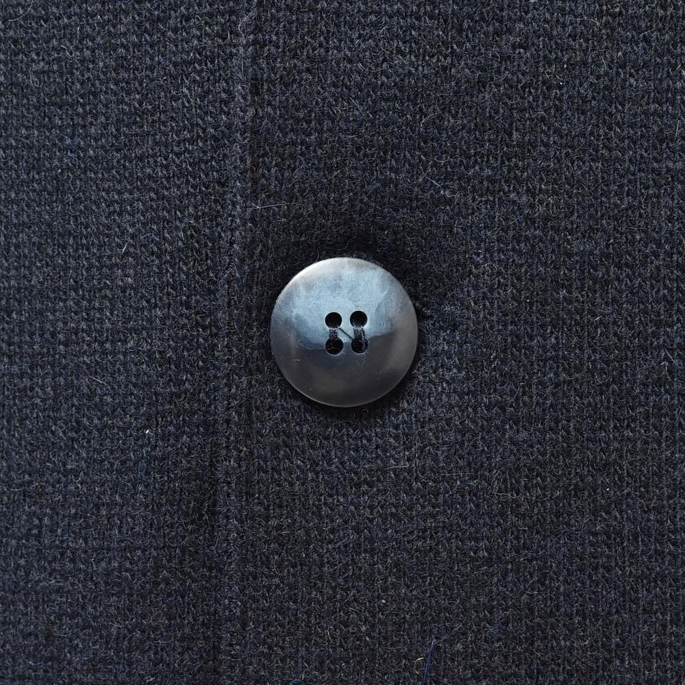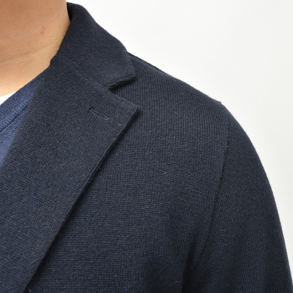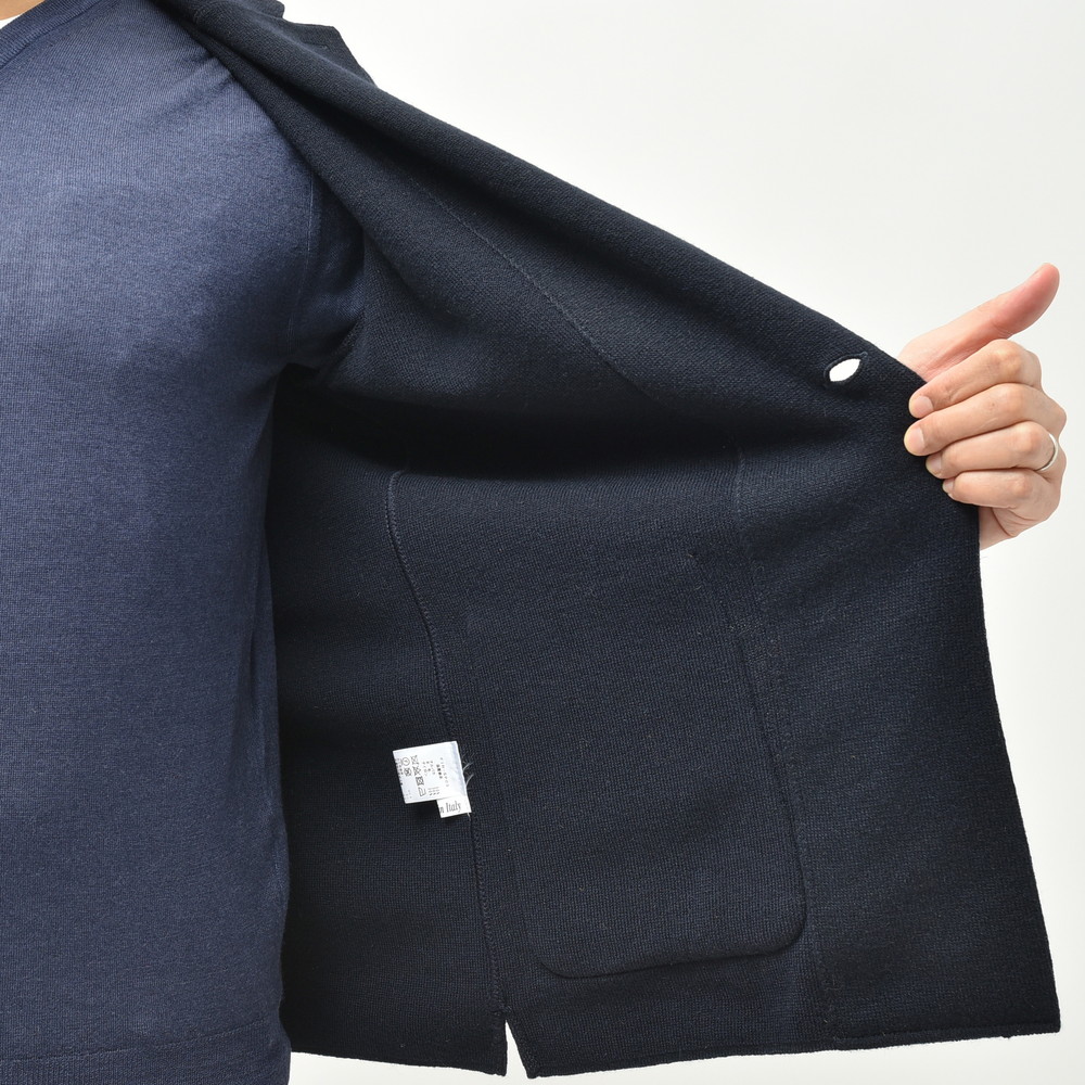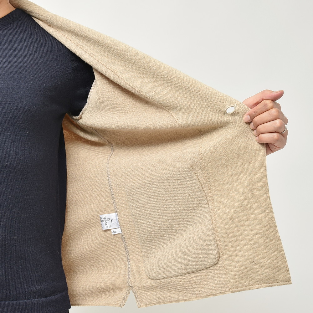 キチッとしたラペルがセットされてニットジャケットでは極めて珍しいタイプでして、ウエストのシェイプがほぼ無く、ベントの代わりにサイドスリットを採用する事でワークテイストを表現。かと思えば素材にはアルパカをベースにしたムードのあるニットを使用。