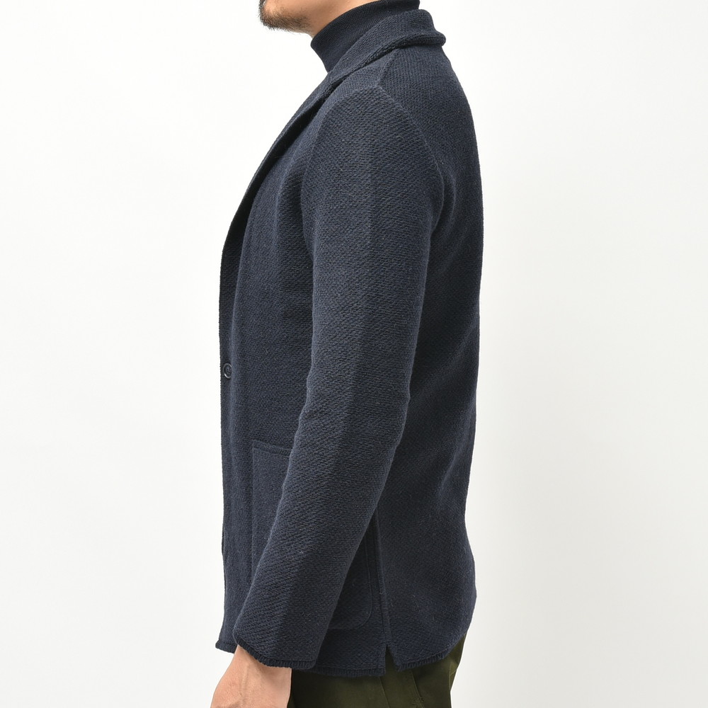 ちょっと珍しいワンボタンタイプのニットジャケットになっておりまして、意外とありそうでない逸品という感じがします。ピタッとしすぎる感じではないんですが全体的に体シャープに見えるのも良い所かと。