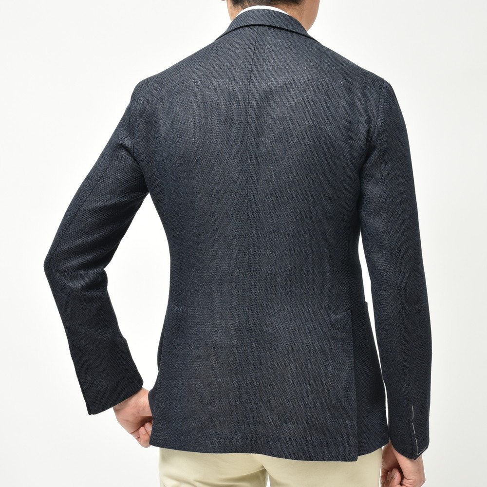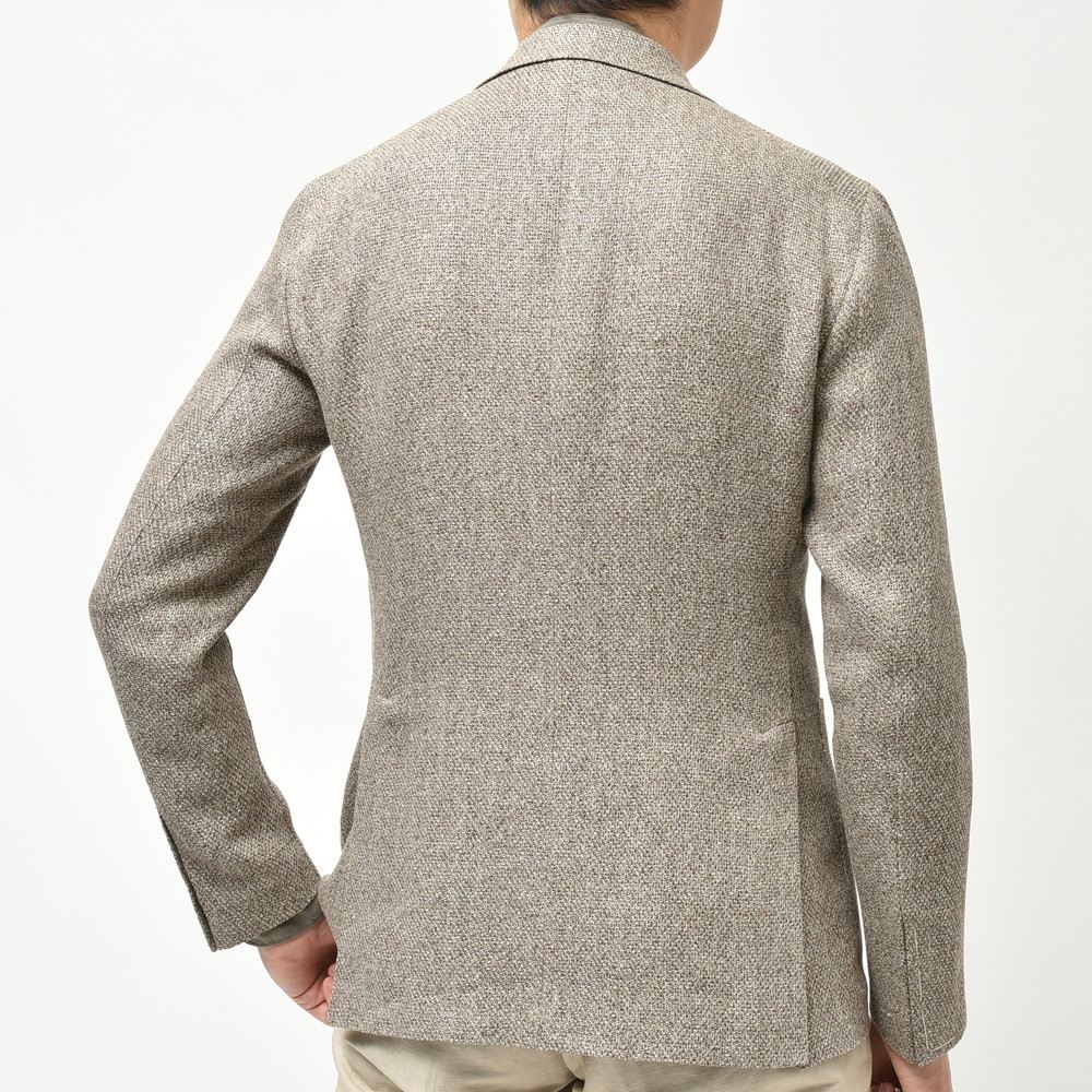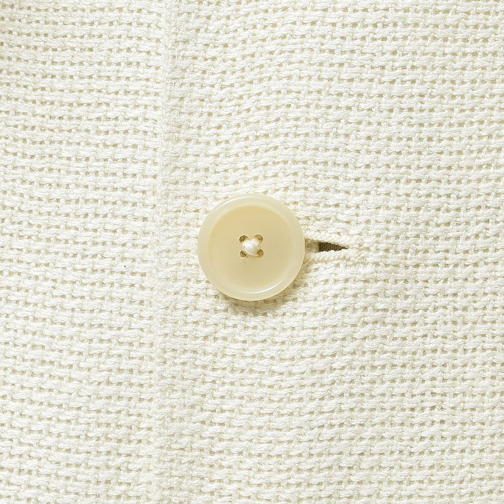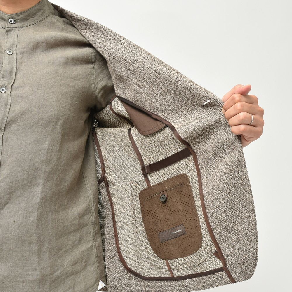 ベタな単色を用いず、メランジ調の見え方になるように糸の色に変化をつけているところもポイントでして、羽織った時の華やかさと奥深さは春夏シーズンのジャケットとして群を抜いているように感じます。