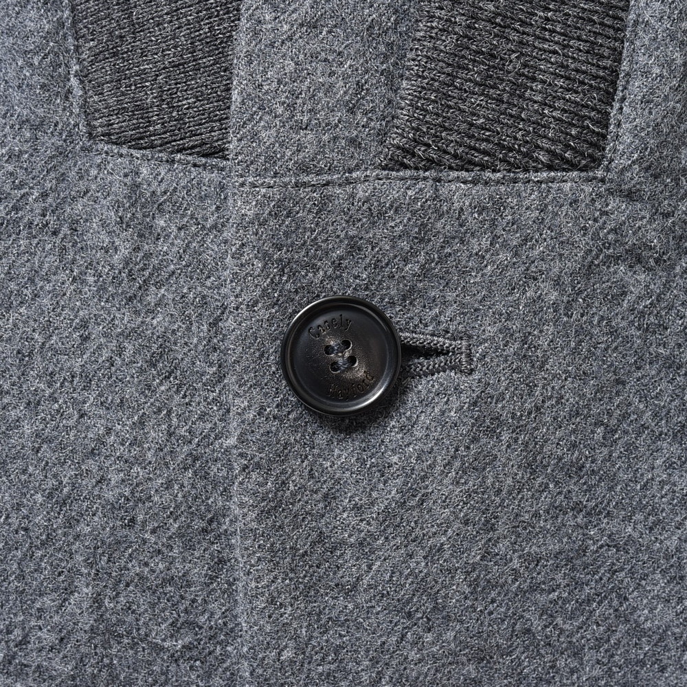 ラペルやカラーを単純に取り払うだけでなく、そこにニットのリブをセットしてしまうところにCasely Hayfordのクリエイティブ魂を感じます。