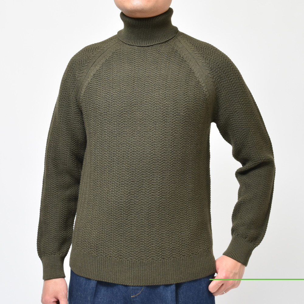 普通なら何色かで展開しそうなタートルネックニットですが、気合の一色展開!しかもオリーブという妙に攻めたセレクトです。