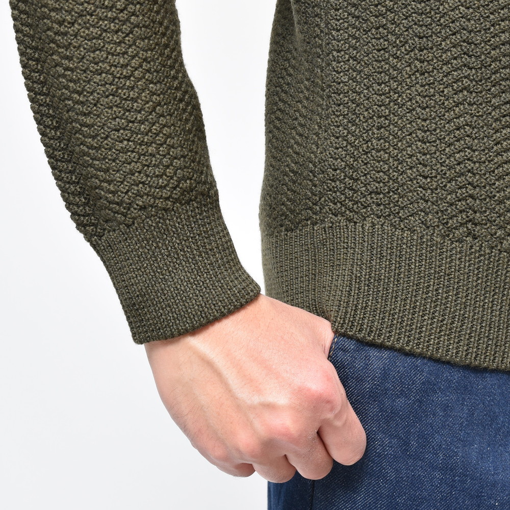 ヘリンボーン調の編み地が特徴的で、シンプルなんですけどちょっと珍しい仕上がりでしょうか。イタリアブランドのニットは編地に変化をつけるテクニックを採用することがありますが、忘れてはいけないのがJACOB COHENはデニムブランドだという事。